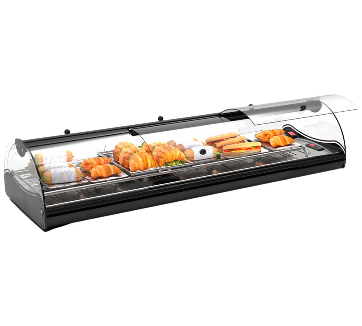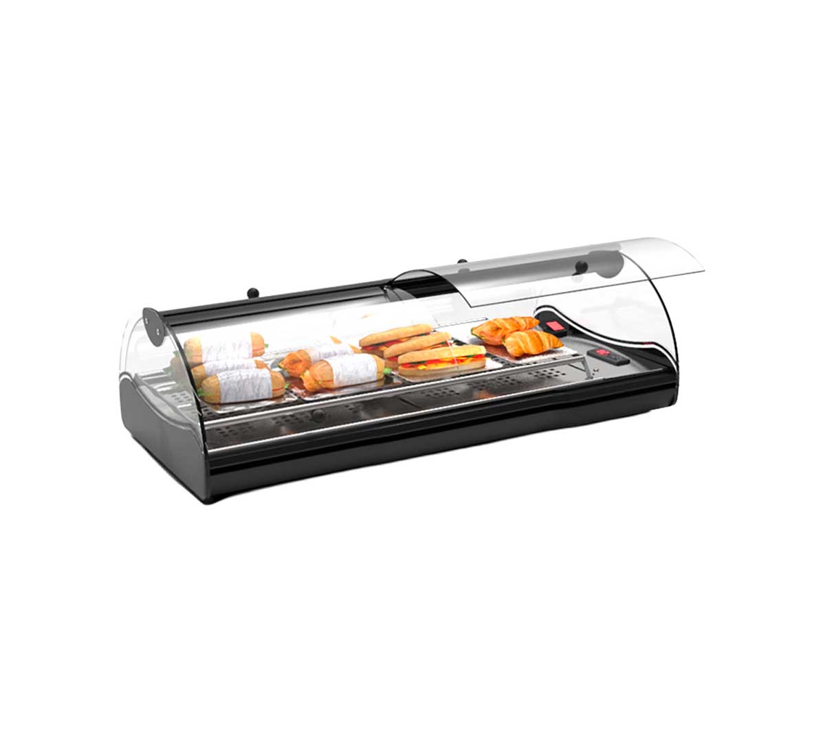 Calienta tapas para bares con puertas delanteras y traseras ideal para autoservicio. El sistema de calentamiento es mediante calor seco. Perfecta para productos de bollería y bocadillos.