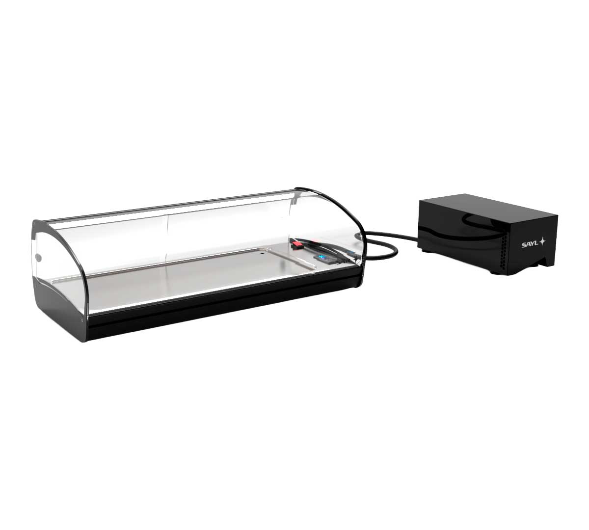 La Vitrina Refrigerada Shark Grupo Remoto Cuba Plana de Sayl incluye el grupo frigorífico y cable de 2 metros. El motor no está dentro de la vitrina. Es un motor externo por lo que es ideal para optimizar el espacio en zonas reducidas.