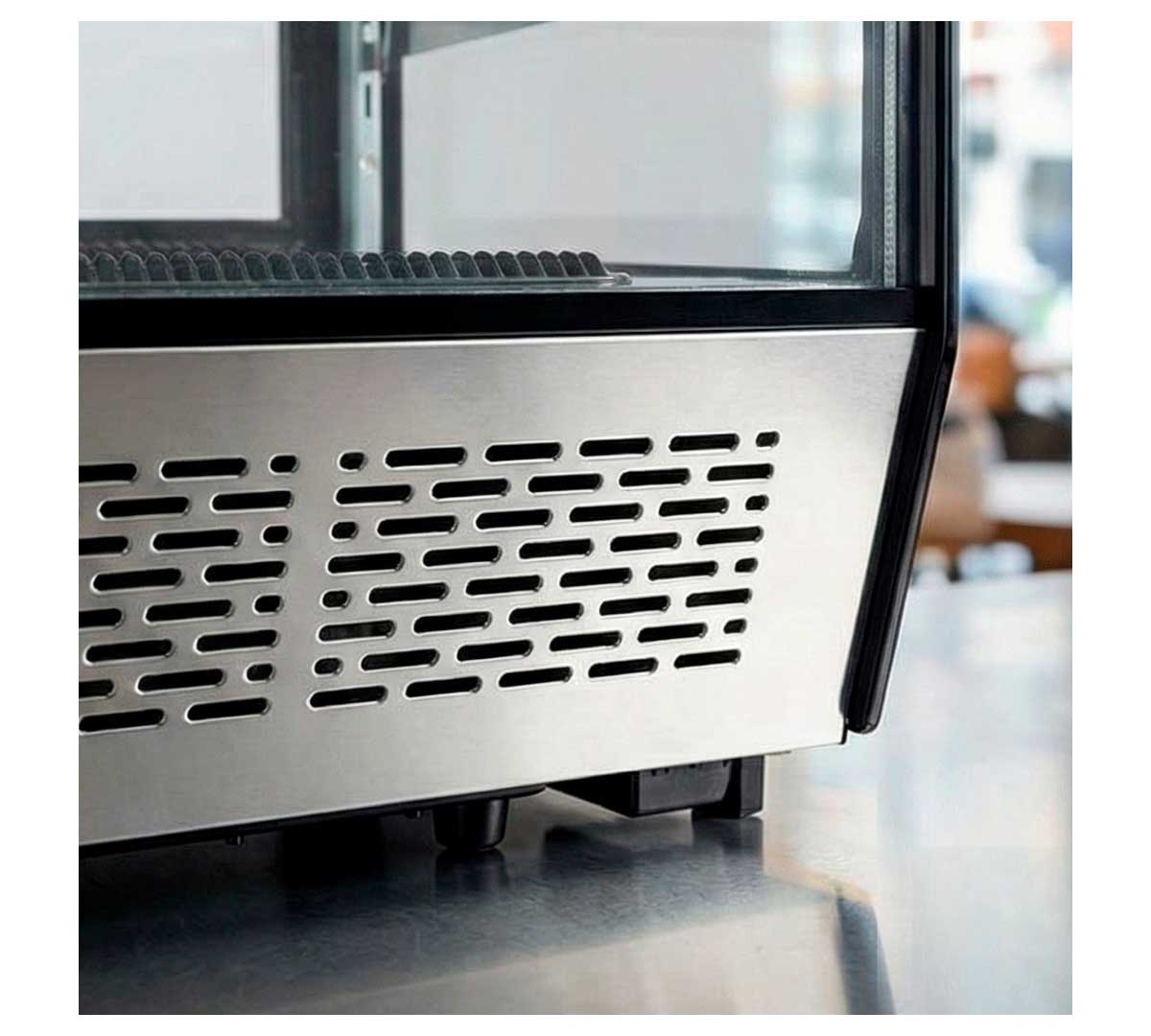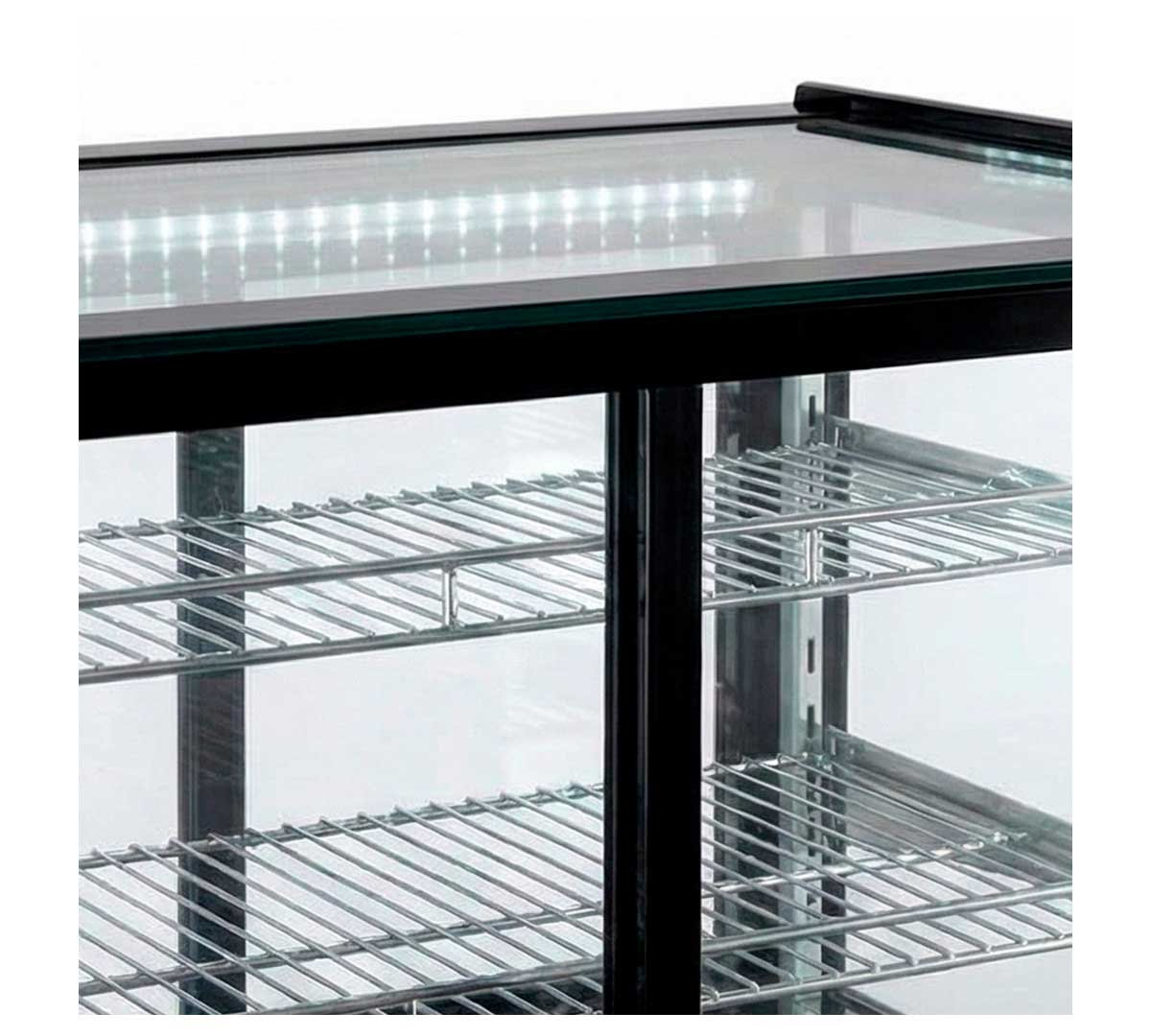 Expositor refrigerado de sobremesa para postres, lácteos y bebidas. Tiene iluminación LED, estantes regulables en altura, puertas correderas de acceso trasero y 4 caras de cristal.