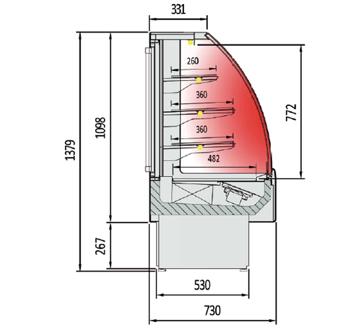 Vitrina expositora caliente con cristal curvo, control electrónico de temperatura, doble acristalamiento templado y cajón humidificador. Incluye iluminación led y estantes de alambre de acero regulables en altura. La perfilería es de aluminio anodizado. Está disponible en color gris, blanco o negro. Para otros colores, consúltanos.