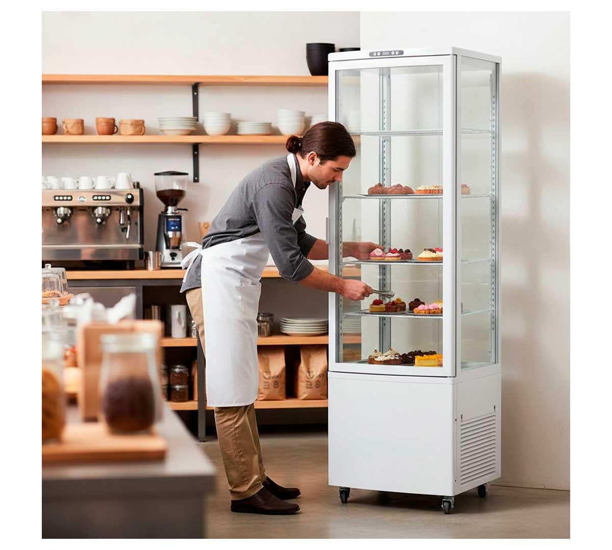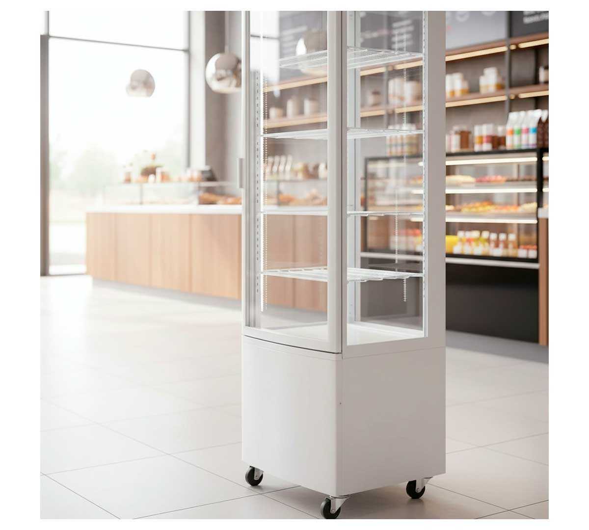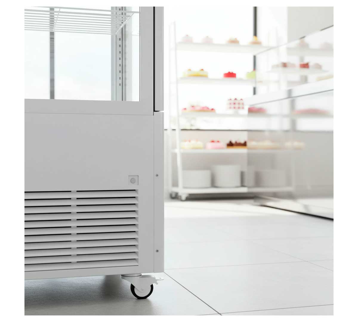 Vitrina expositora con los 4 laterales de vidrio para una vista panorámica. Dispone de puerta para autoservicio, estantes ajustables y ruedas. Con desescarche automático y termostato variable. Es ideal para bares cafeterías y pastelerías.