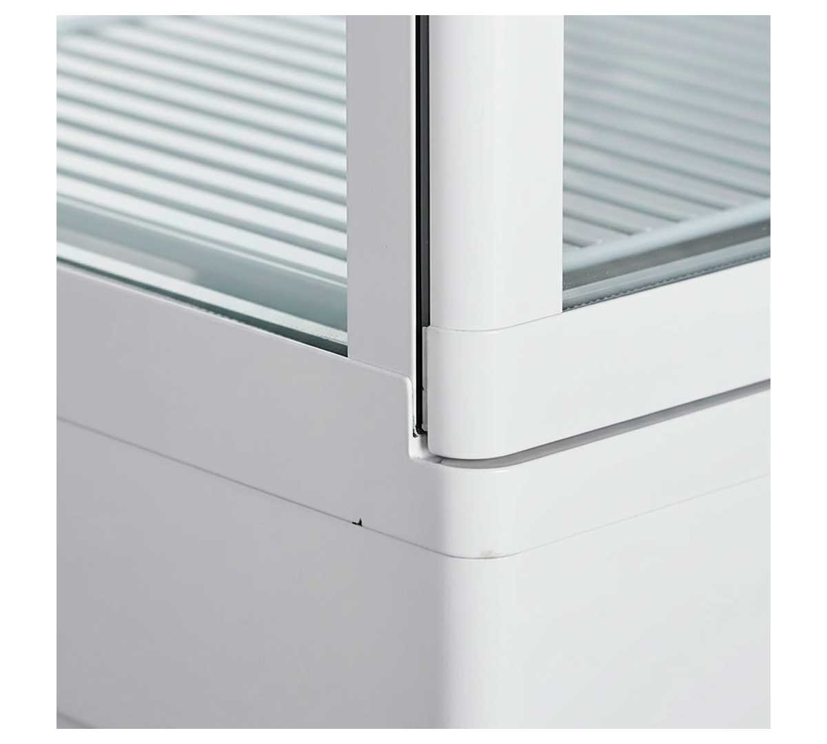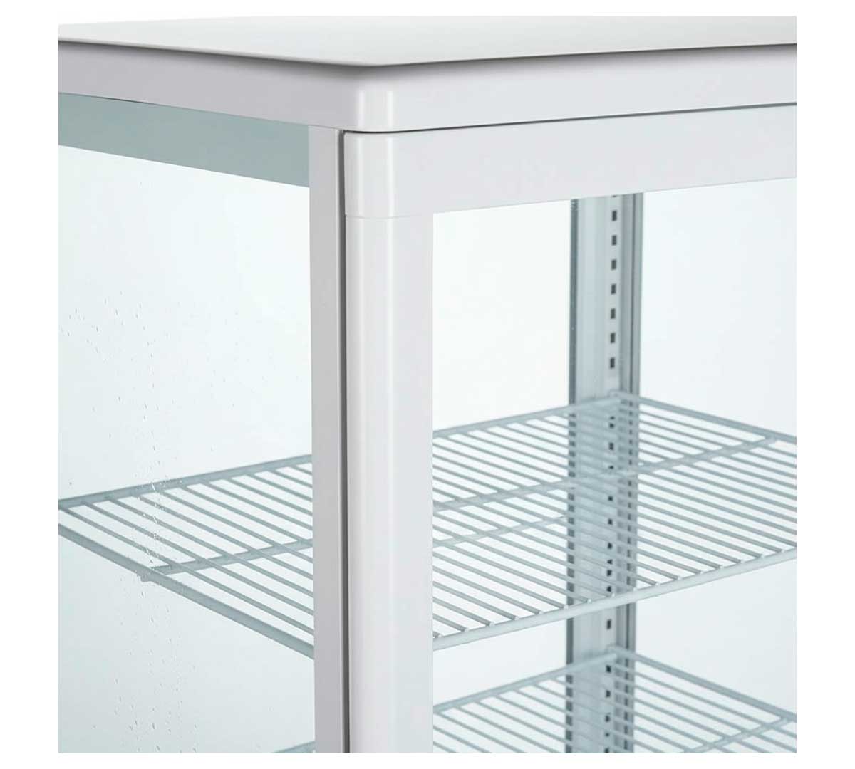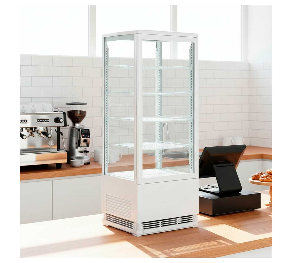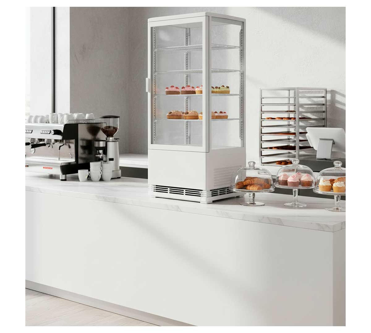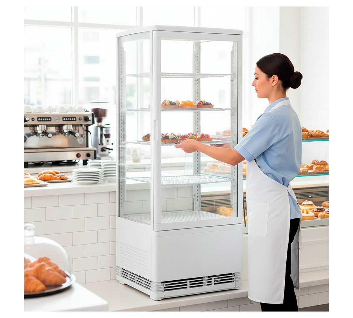 Vitrina expositora con los 4 laterales de vidrio para una mayor exposición de los productos. Dispone de puerta para autoservicio y estantes ajustables. Con desescarche automático y termostato variable. Es ideal para bares cafeterías y pastelerías.