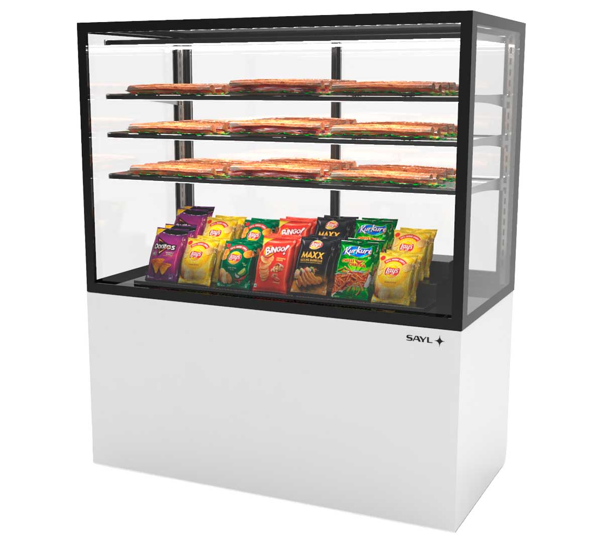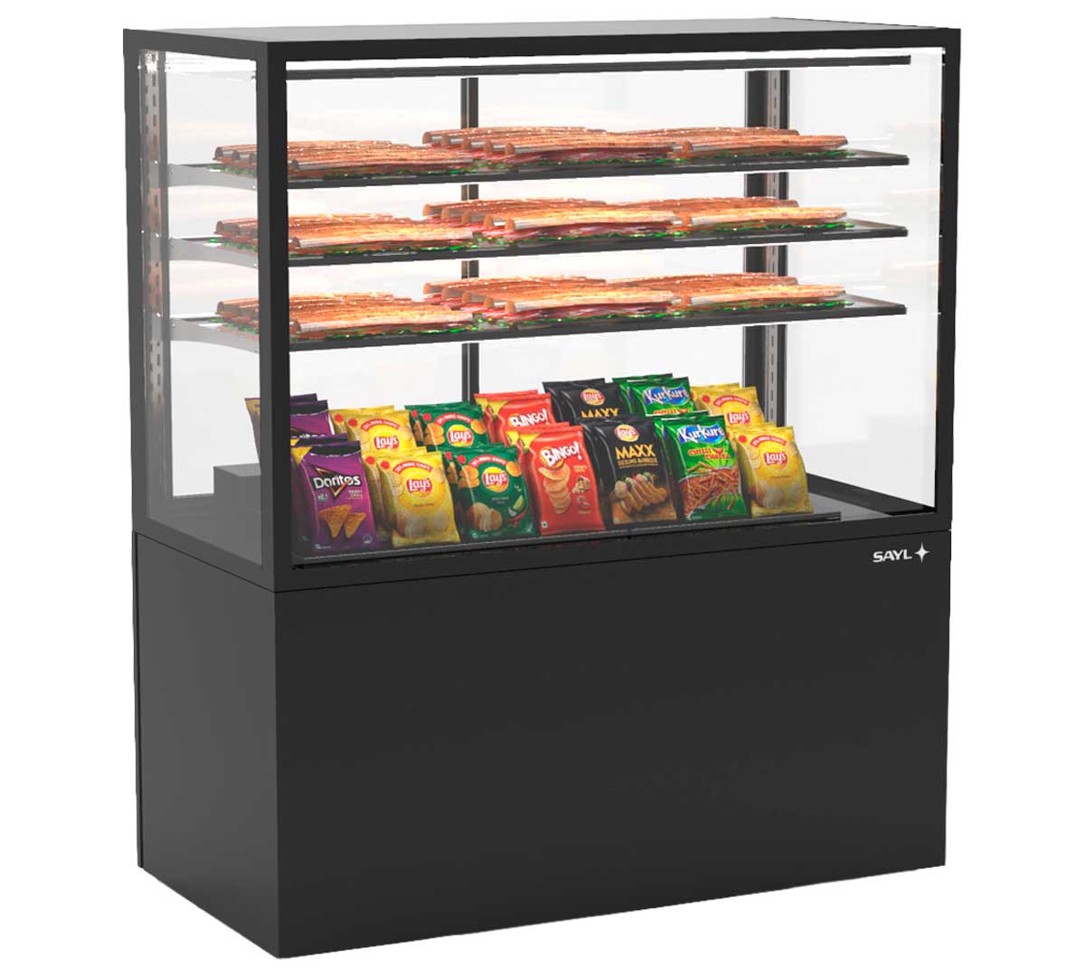 La Vitrina Expositora Integra con Base Neutra 120 de Sayl tiene una base de 120 cm de ancho. Es una solución avanzada para la exposición y conservación de productos en negocios de restauración y alimentación.