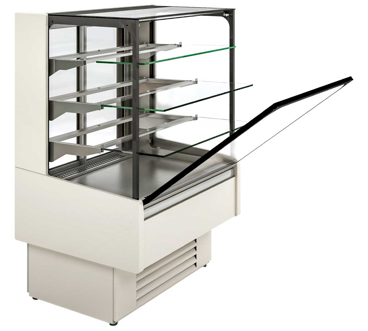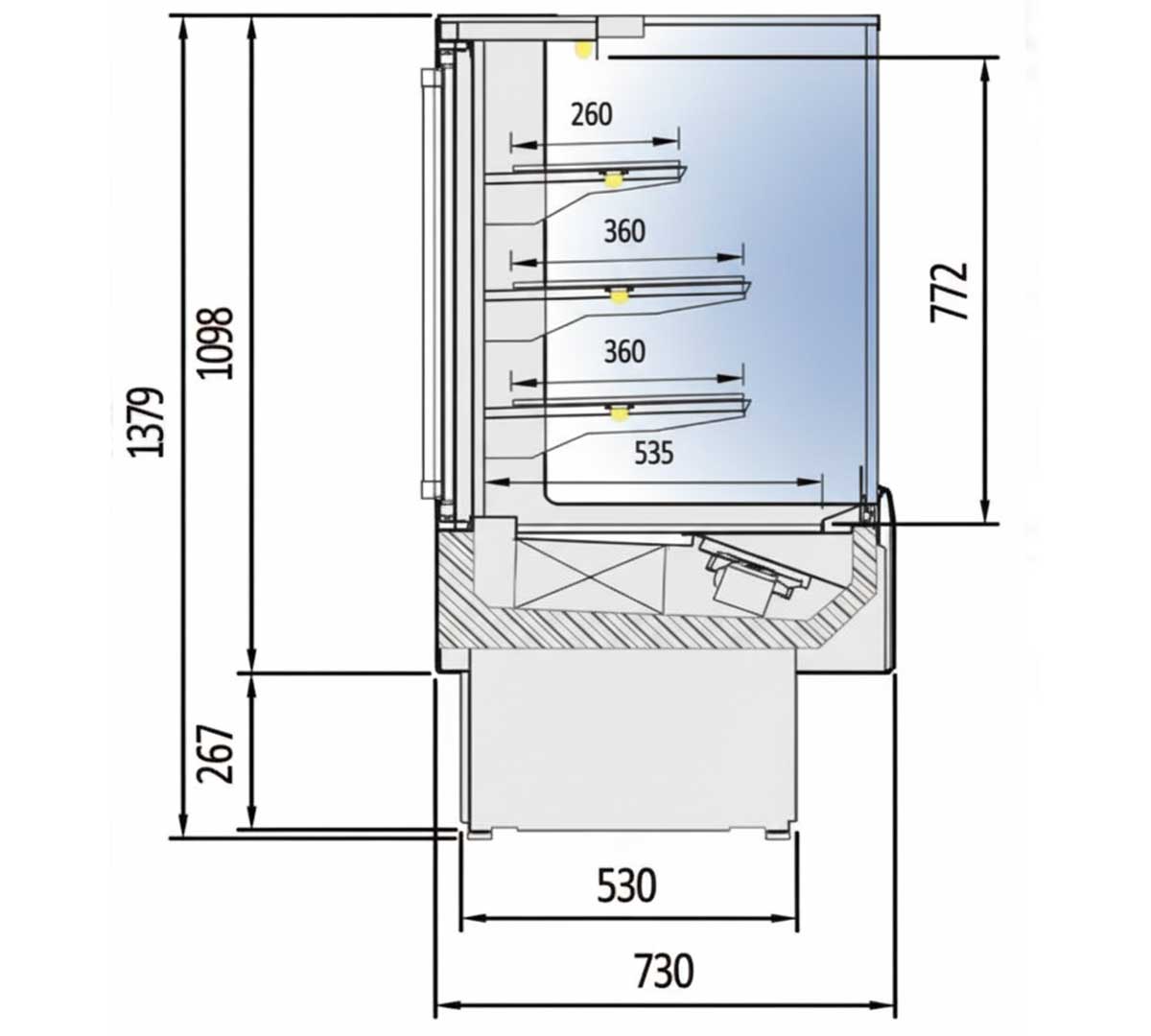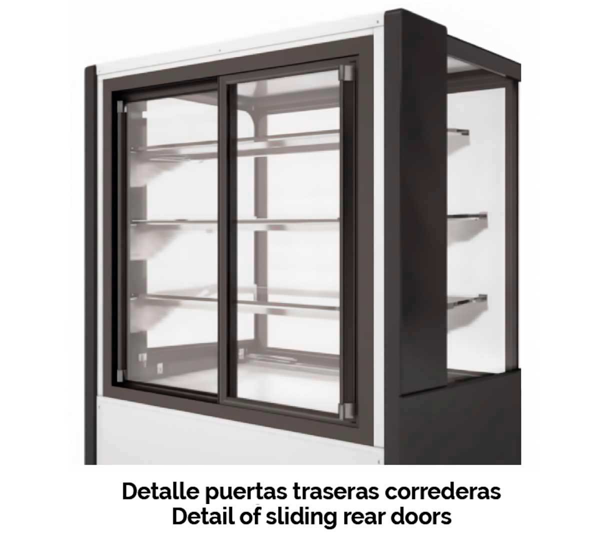 Vitrina semimural con cristal recto diseñada para conservar y exhibir productos frescos, snacks, bebidas, etc. Permite un rango de temperatura entre 2 y 8 °C. Está disponible con 1 puerta abatible o 2 puertas correderas en la parte trasera en color negro. El vidrio frontal es doble y abatible. Incluye 3 estantes de vidrio securizado regulables en altura y con iluminación. Posibilidad de elegir entre 19 colores.