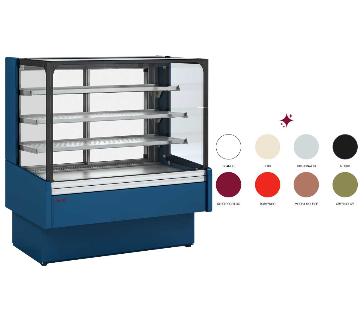 Vitrina semimural con cristal curvo diseñada para conservar y exhibir productos de chocolates. Permite un rango de temperatura entre 14 y 17 °C. Está disponible con 1 puerta abatible o 2 puertas correderas en la parte trasera en color negro. El vidrio frontal es doble y abatible. Incluye 3 estantes de vidrio securizado regulables en altura y con iluminación. Está disponible en 19 colores.