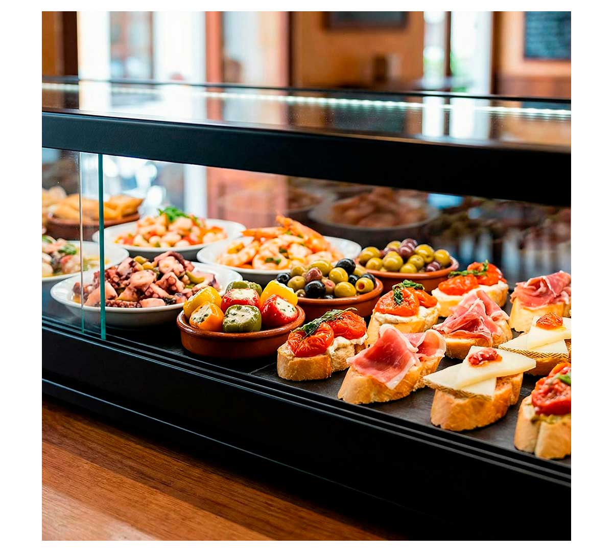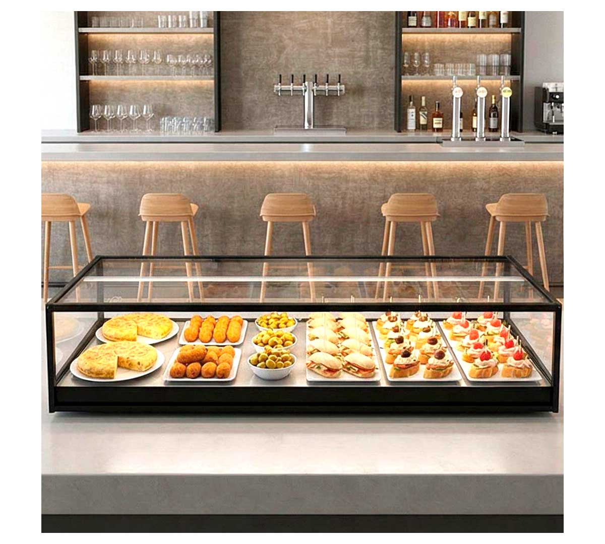 Vitrina neutra ideal para tapas. De cristal plano con acceso por la parte trasera. Esta vitrina combina con otros expositores fríos o calientes de la misma línea Logic. Está disponible en varios tamaños. No tiene estante.