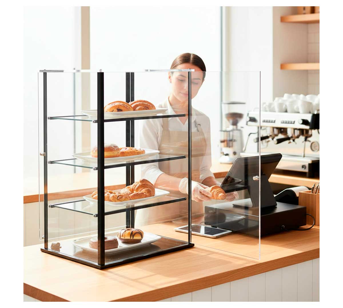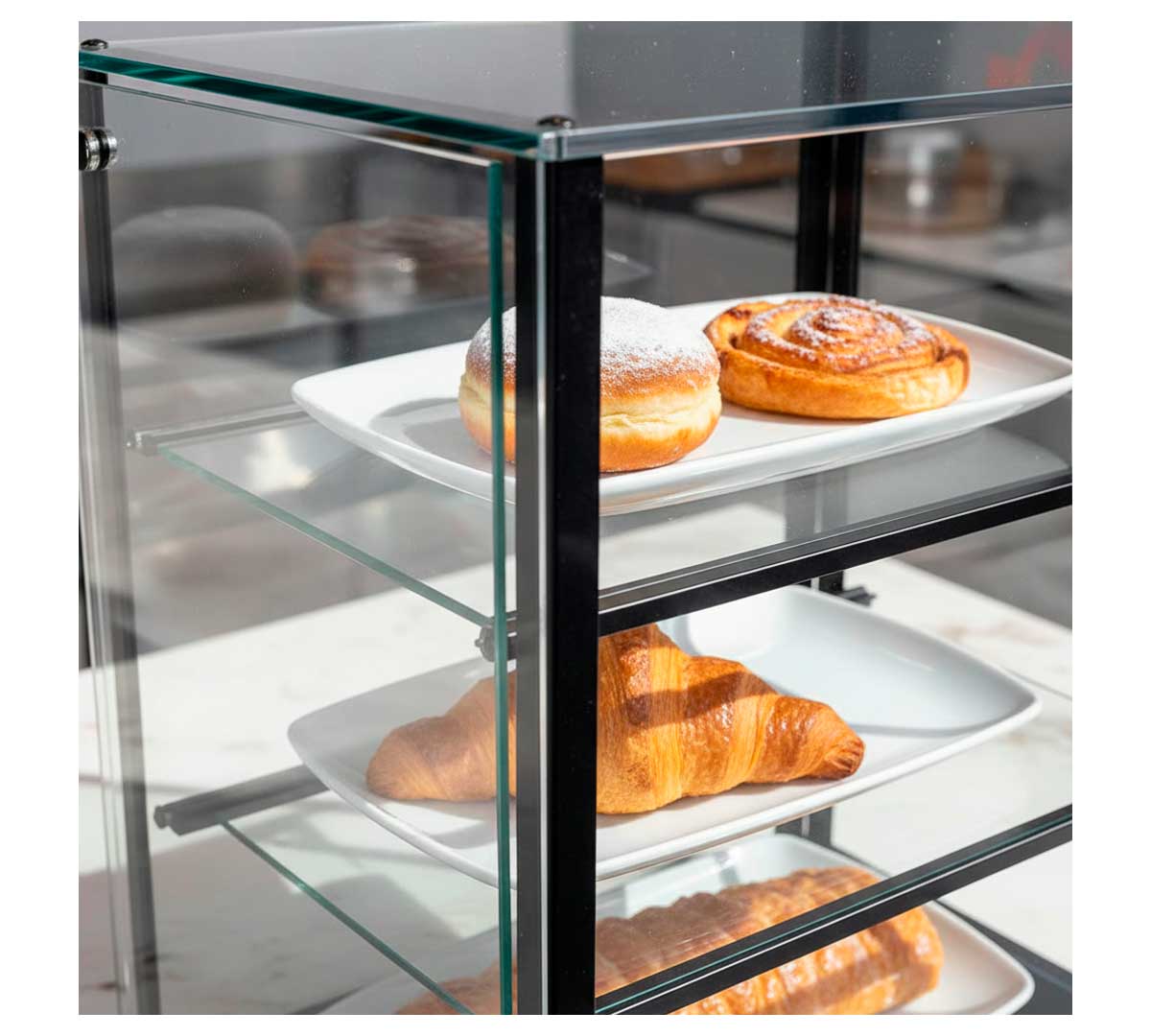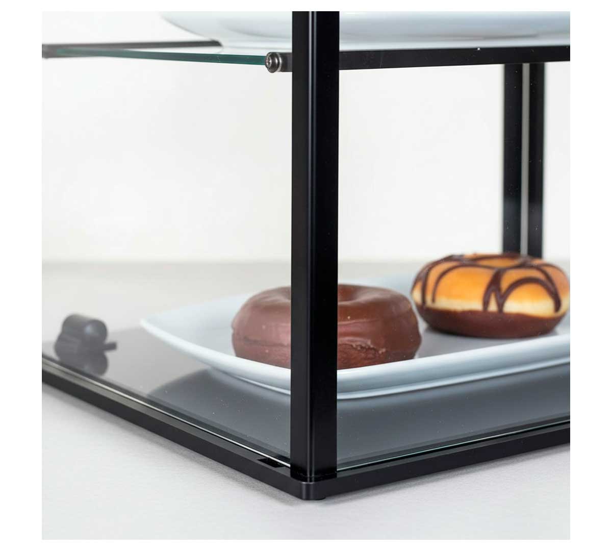 Vitrina neutra de 4 pisos y cristal recto en versión compacta. Está fabricada en aluminio lacado color negro con metacrilato. Dispone de 3 estantes fijos y laterales de metacrilato.