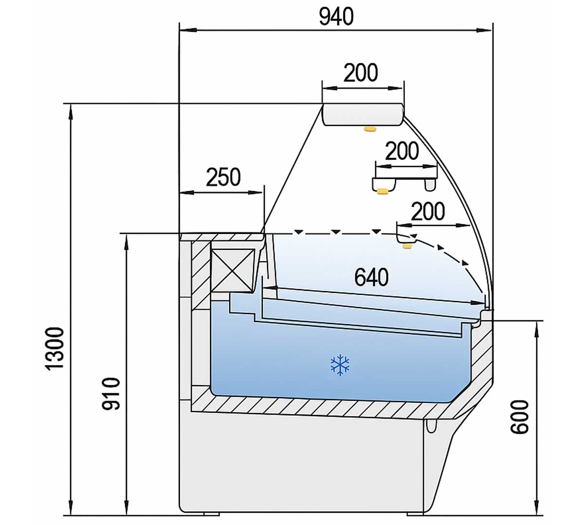 Expositor refrigerado para pastelería con cristal curvo securizado y frontal abatible. El rango de temperatura de trabajo es de 0 a +6 °C. Incluye reserva refrigerada, enchufe auxiliar con capacidad máxima de carga de 500 W y 2 estantes intermedios de cristal no refrigerados con iluminación. La franja frontal está disponible en 19 colores. Los laterales y la parte frontal inferior son de color antracita.