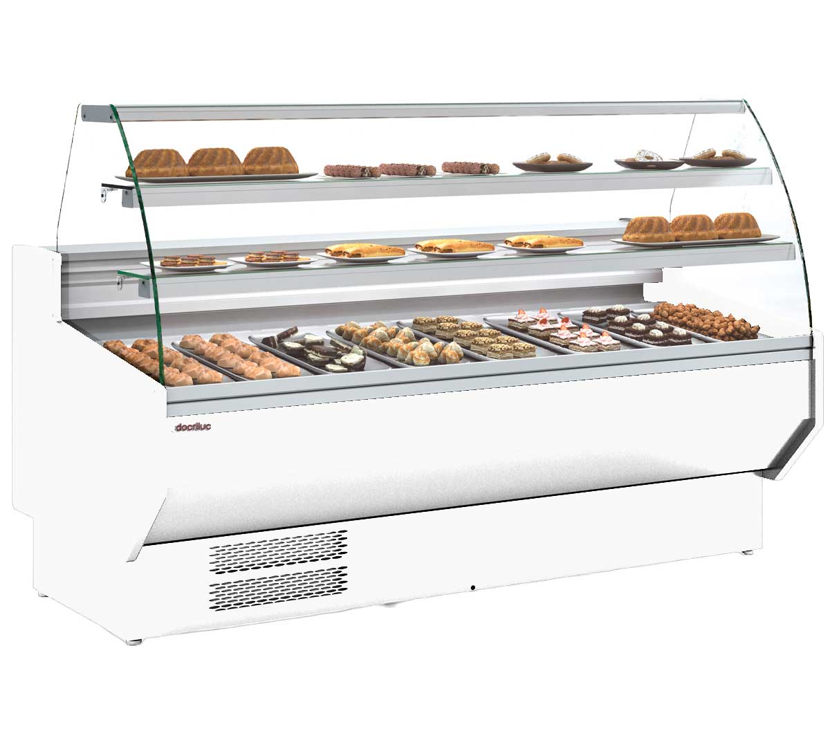 La Vitrina Expositora Neria VEPD-9-C de Docriluc es ideal para pastelerías. Es una solución de exposición refrigerada que combina diseño curvo y tecnología avanzada para la presentación y conservación de pasteles, bollería y productos frescos.