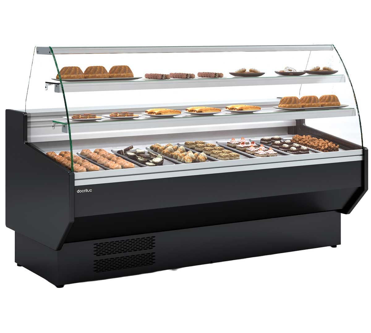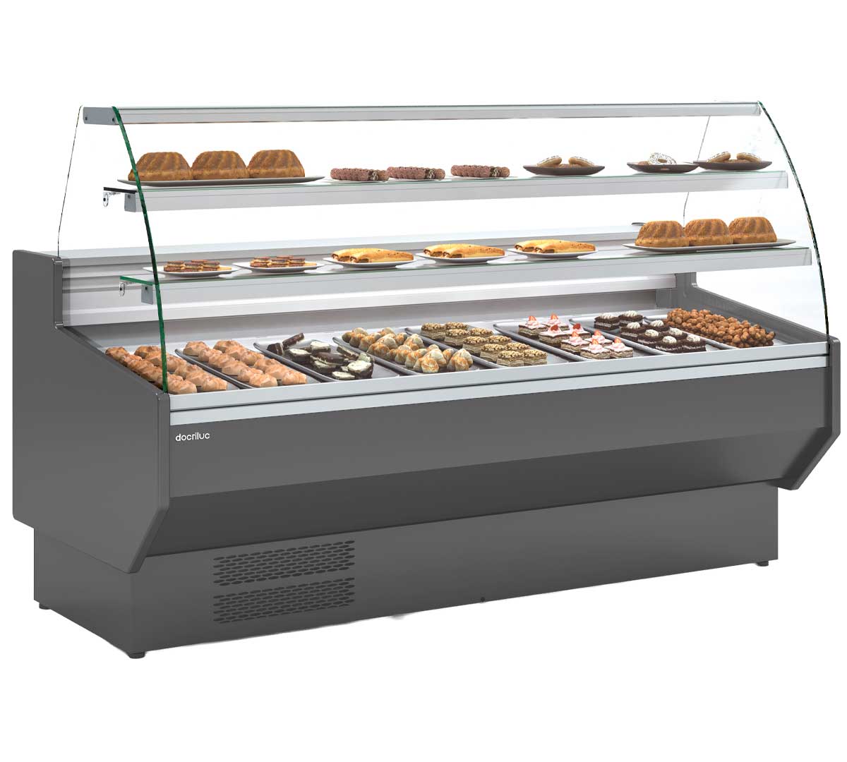 Expositor refrigerado diseñado para pastelería. Con cristal frontal curvo, perfil de aluminio, iluminación LED integrada, encimera en acero inoxidable y condensación ventilada. Tiene una temperatura de trabajo de -1 a +5 °C. Incluye reserva refrigerada y 2 estantes de vidrio intermedio con iluminación, no refrigerados. No incluye el enchufe auxiliar. El frontal está disponible en 8 colores y los laterales son de color antracita.