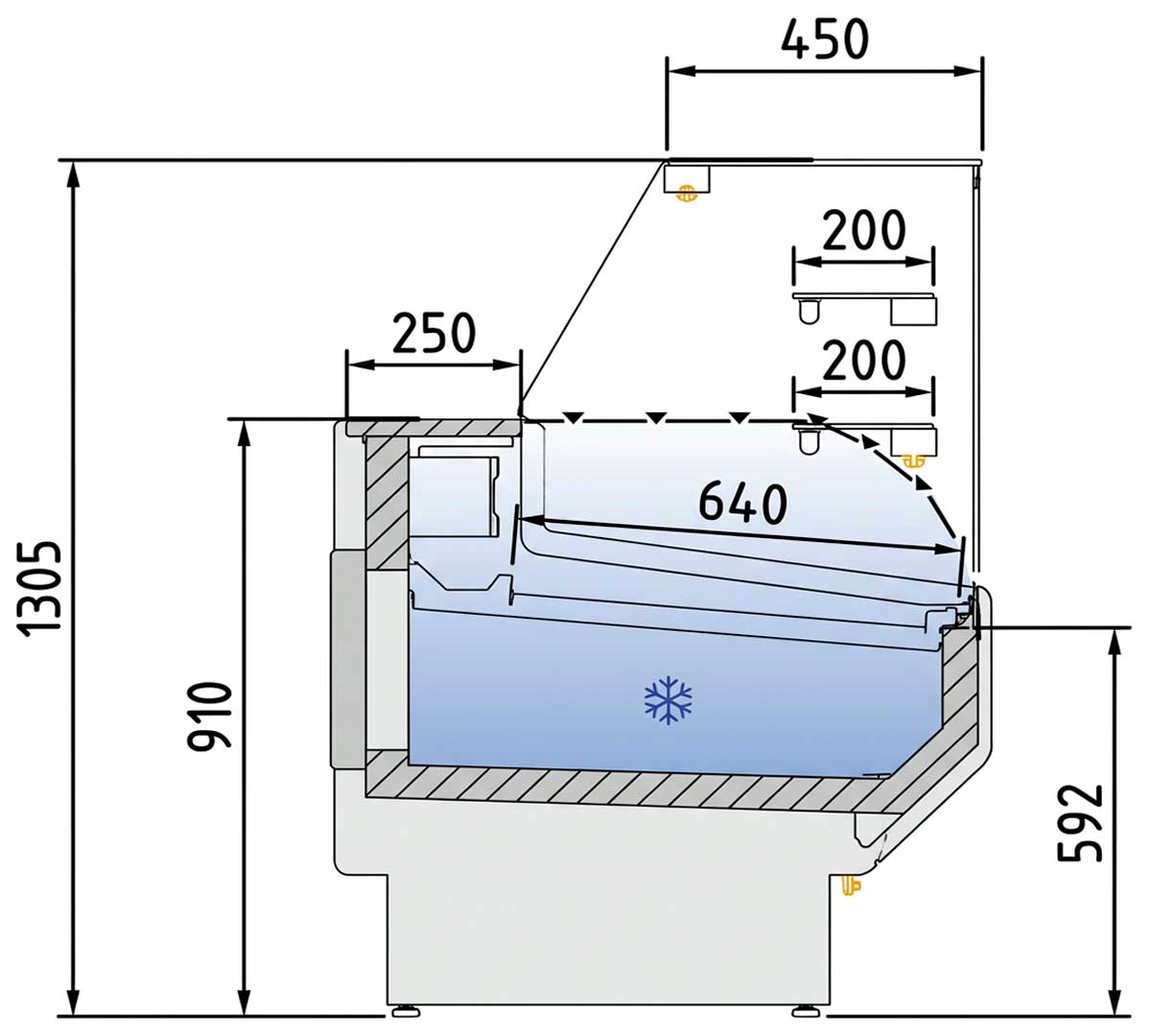 Expositor refrigerado diseñado para pastelería con frontal abatible. Con cristal frontal recto, perfil de aluminio, iluminación LED integrada y condensación ventilada. Tiene una temperatura de trabajo de -0 a +6 °C. Incluye reserva refrigerada y 2 estantes de vidrio intermedio con iluminación, no refrigerados. No incluye el enchufe auxiliar. El frontal superior está disponible en 8 colores. Los laterales y la parte frontal inferior son de color antracita.