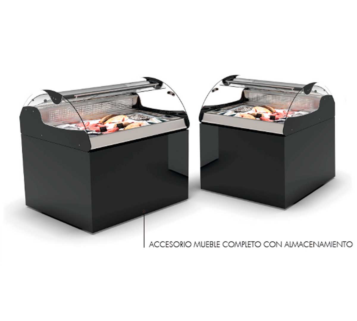 Mueble con almacenamiento para vitrinas refrigeradas, ofreciendo una solución robusta y funcional para la exposición de alimentos en entornos profesionales. Es compatible con Vitrina Expositora VX2 y VX3 Serie XL de Sayl.
