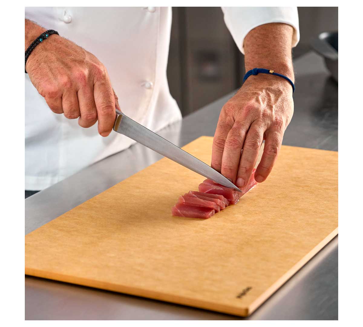 Tabla de corte profesional de 60 x 40 cm fabricada en fibra de papel reciclado con alta densidad y resistencia al corte, diseñada para cocinas profesionales que buscan durabilidad, higiene y sostenibilidad en uso intensivo.