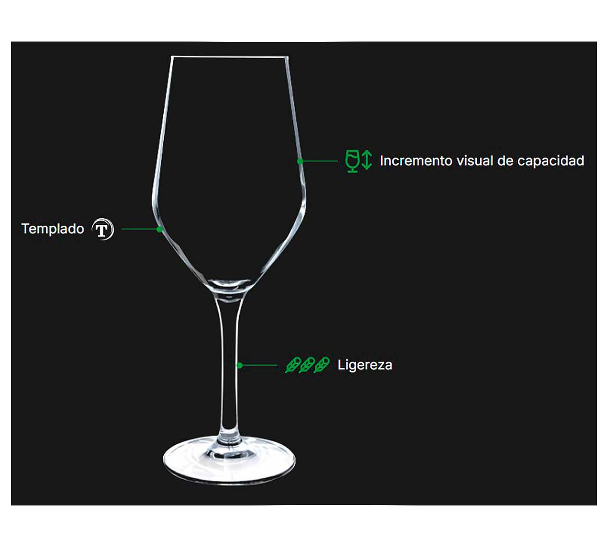 El diseño Vicrila Copa Verdot T es ergonómico y funcional, pensado para simplificar el manejo en entornos de alta rotación como bares, donde se aprovecha su resistencia y facilidad para reposición rápida.