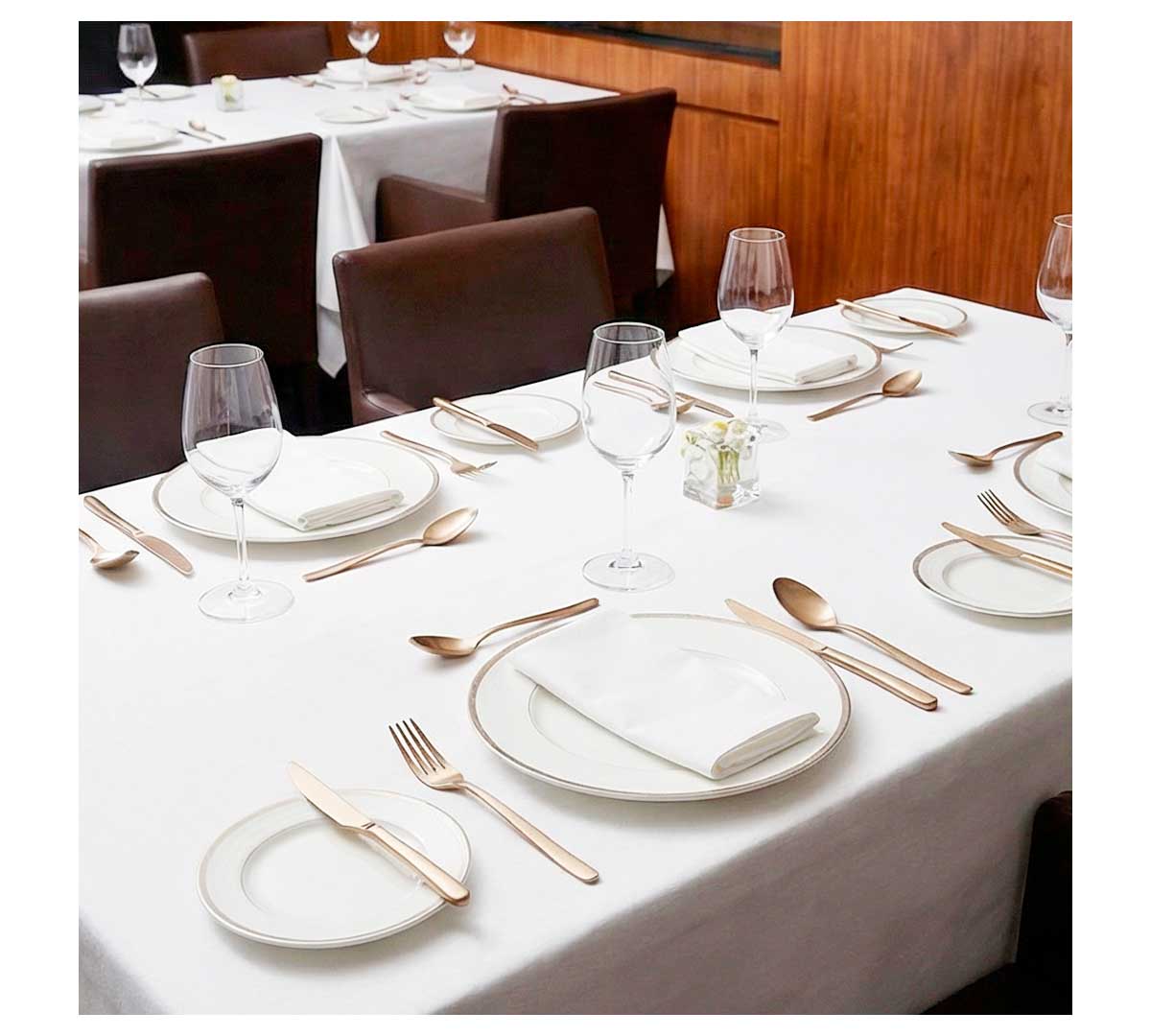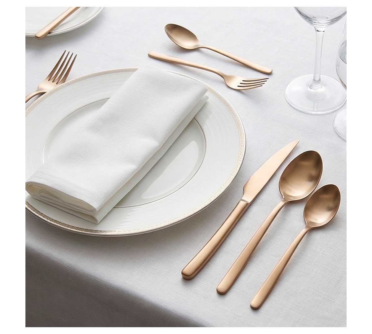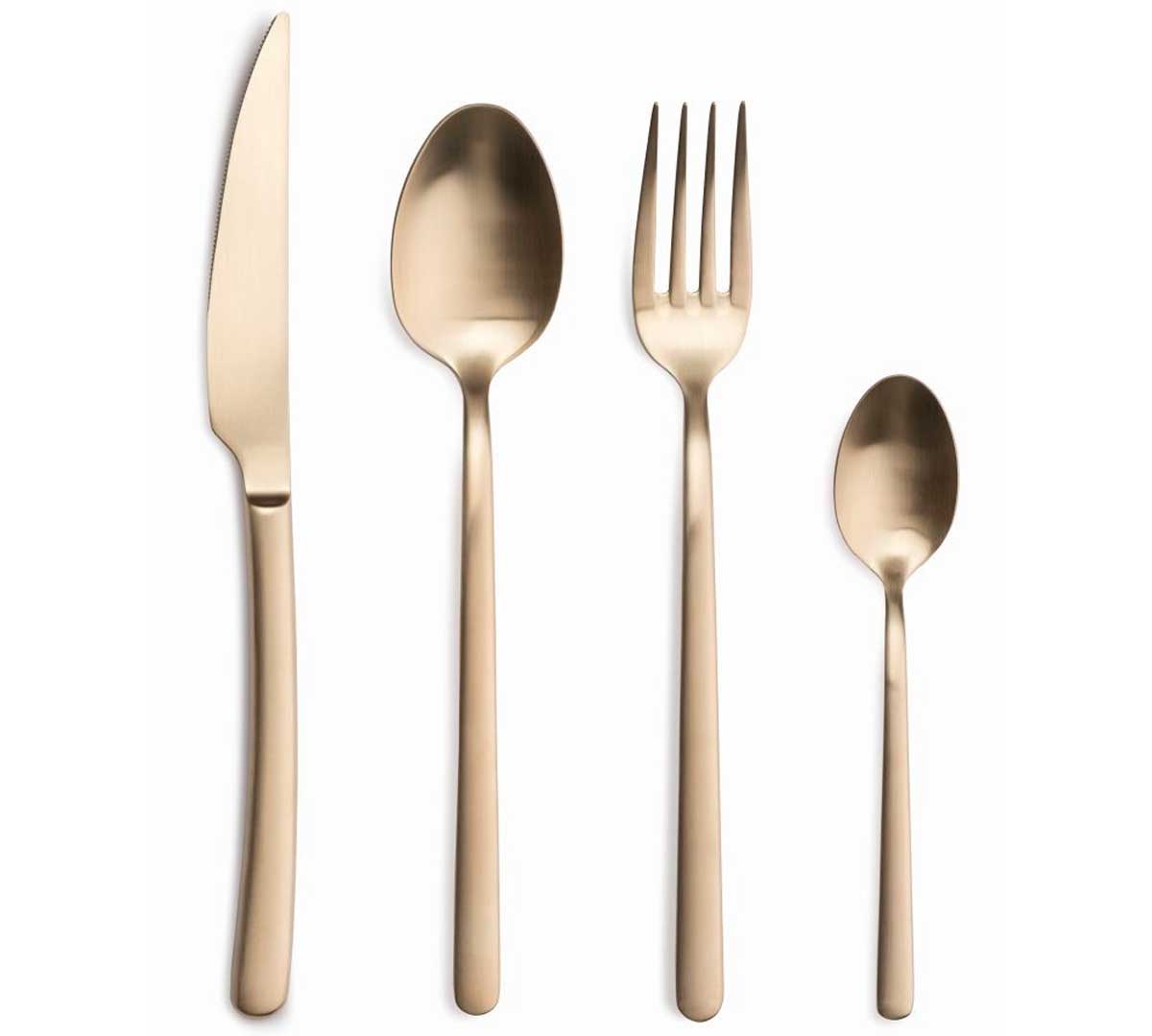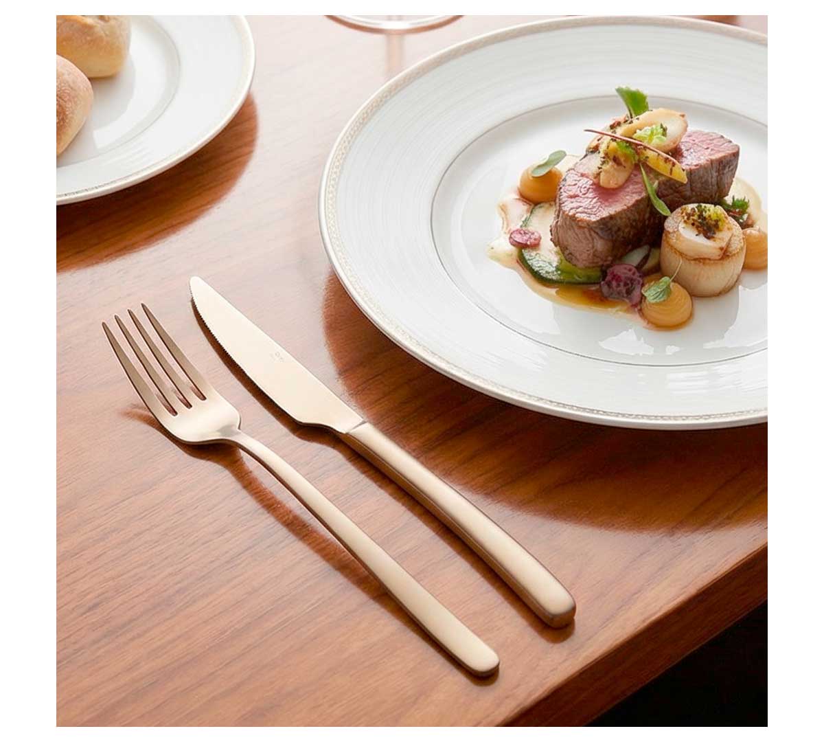 Cubertería en acero inoxidable 18% sin níquel. Acabado satinado champagne y diseño elegante. Incluye piezas para mesa, postre, café y moka. Ideal para servicio completo en sala. Disponible en piezas sueltas y juego de 24 unidades.