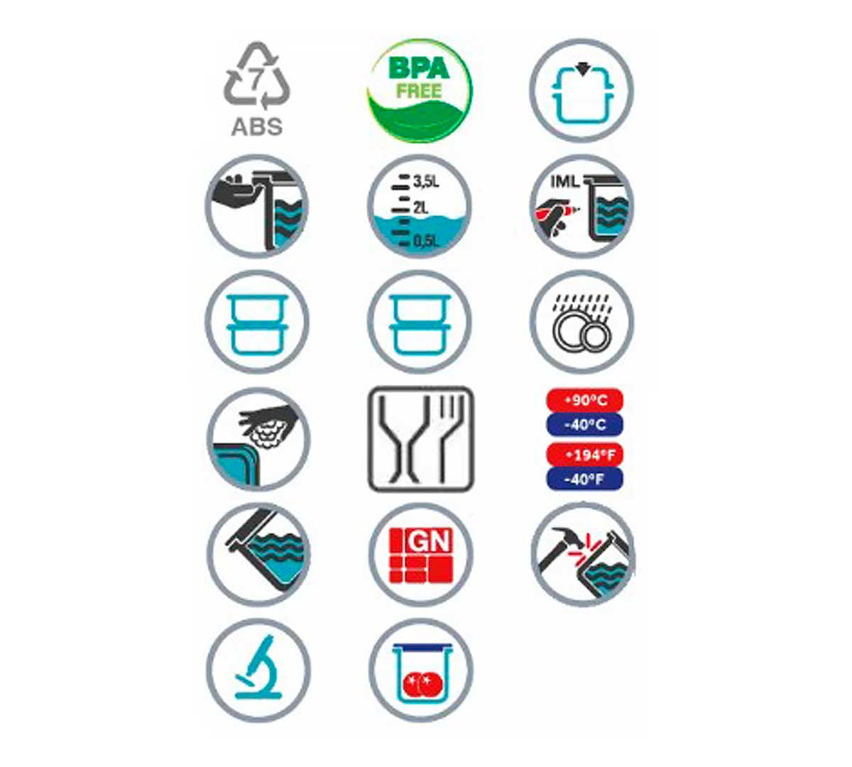 Recipientes herméticos de polipropileno sin BPA. Aptos para congelador, microondas y lavavajillas. Con etiquetas integradas para trazabilidad. Rango de temperatura de -40 °C a 90 °C.