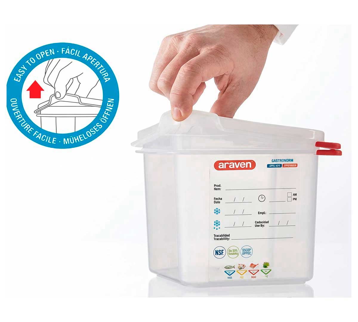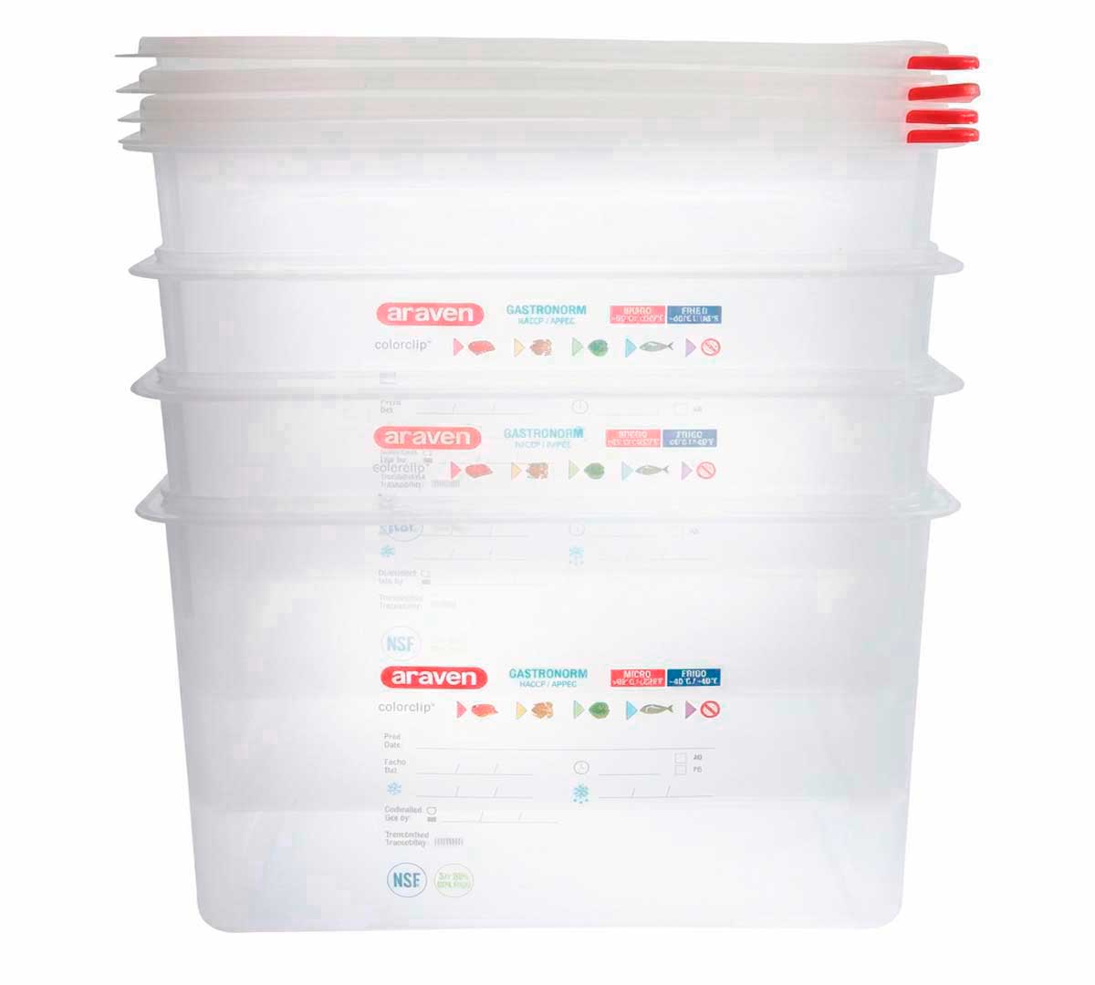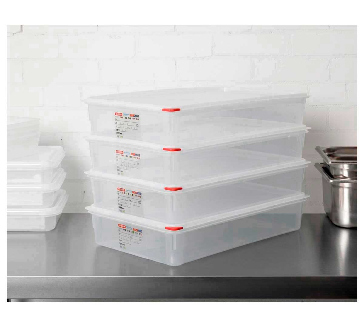 Esta cubeta tiene unas medidas gastronorm GN 1/1 (53 x 32,5 cm). Se caracteriza por el cierre hermético y los clips de identificación de colores incluidos. Está disponible con tres alturas y capacidad diferente.