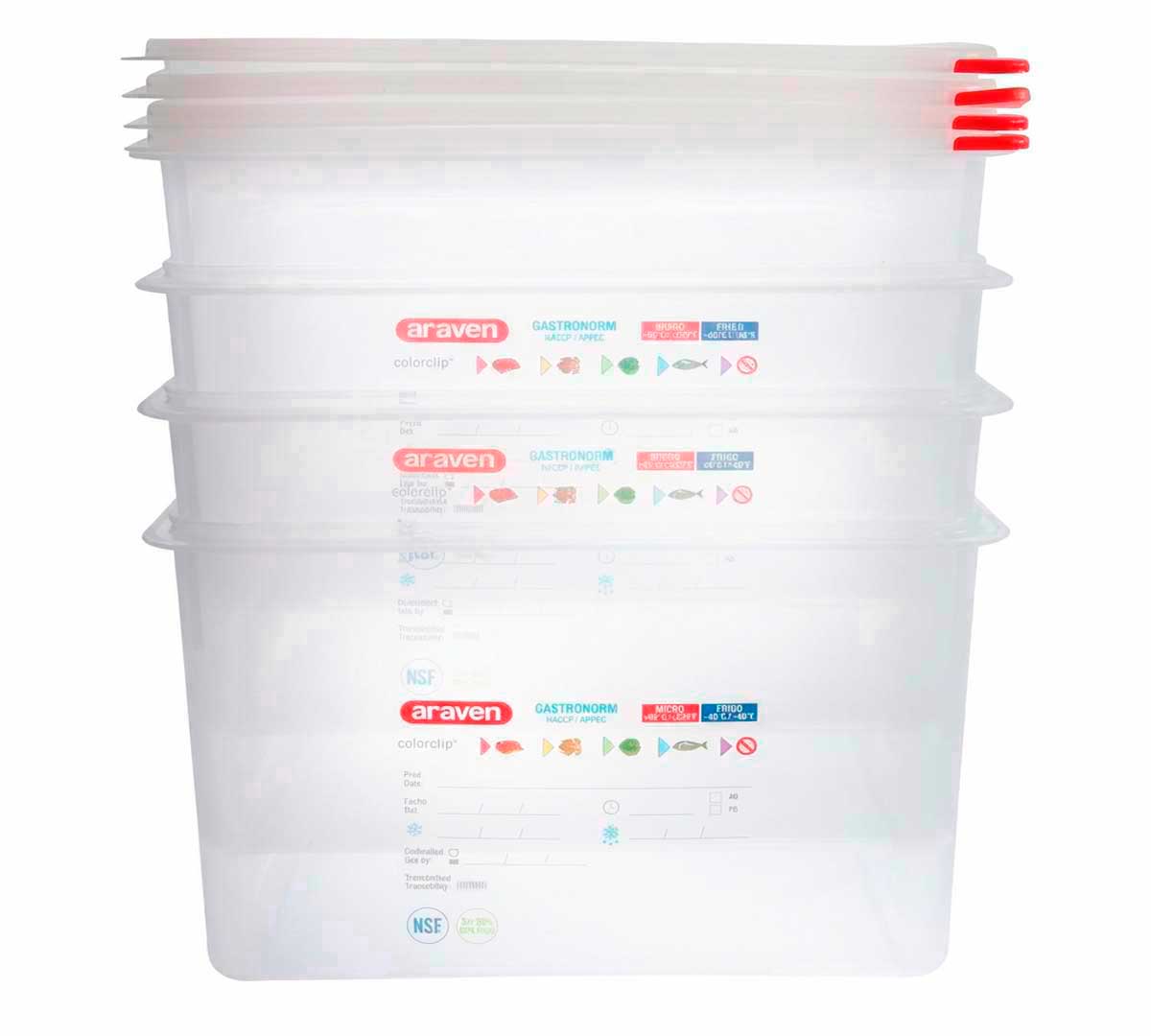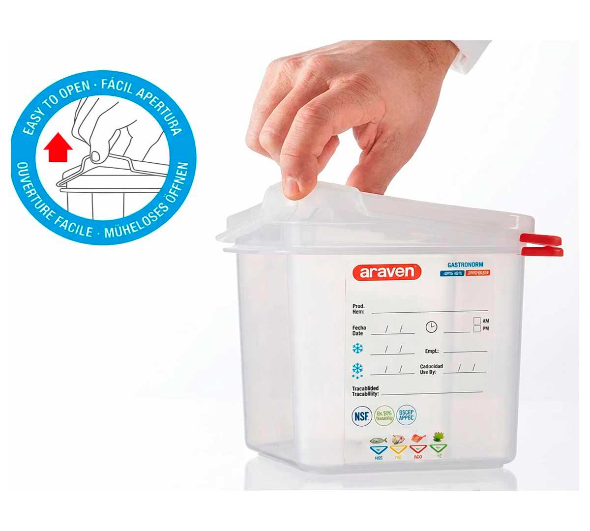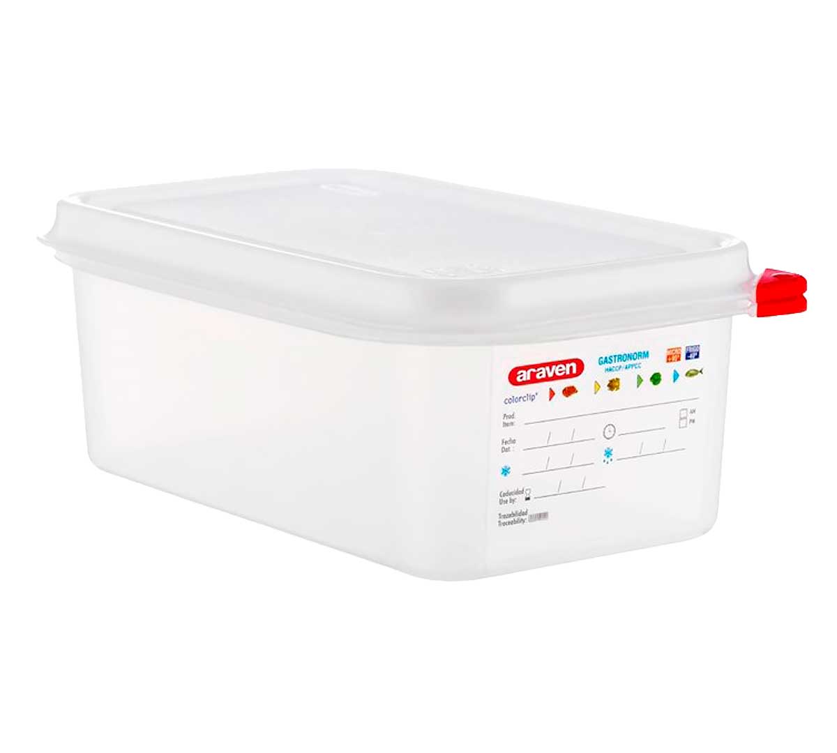 Esta cubeta tiene unas medidas gastronorm GN 1/4 (26,5 x 16,2 cm). Se caracteriza por el cierre hermético y los clips de identificación de colores incluidos. Está disponible con tres alturas y capacidad diferente.