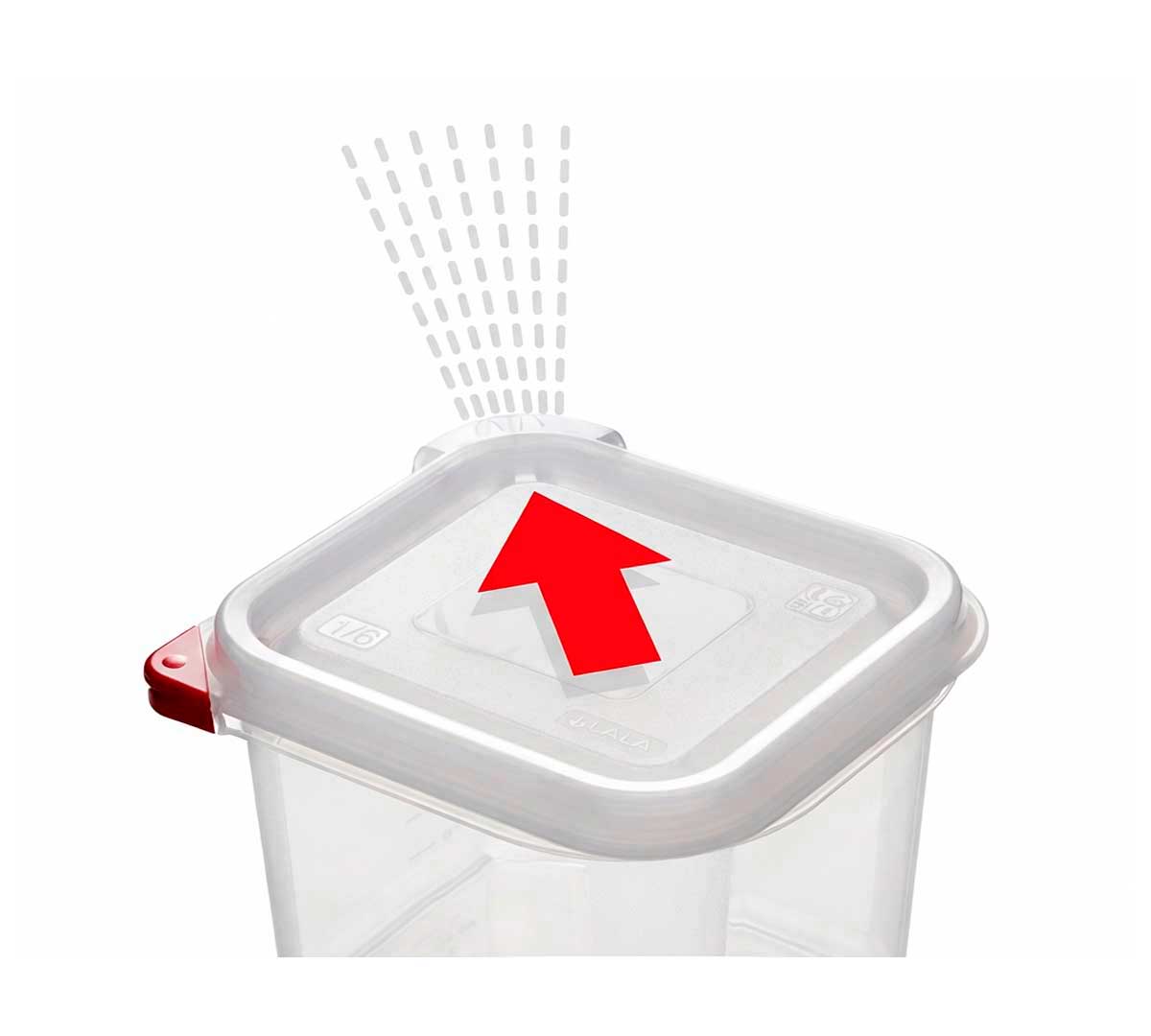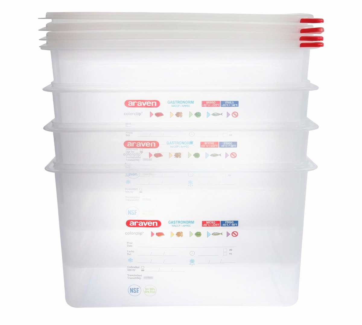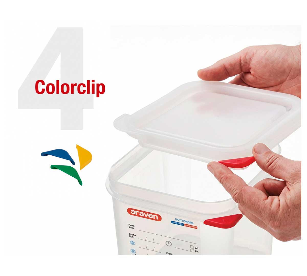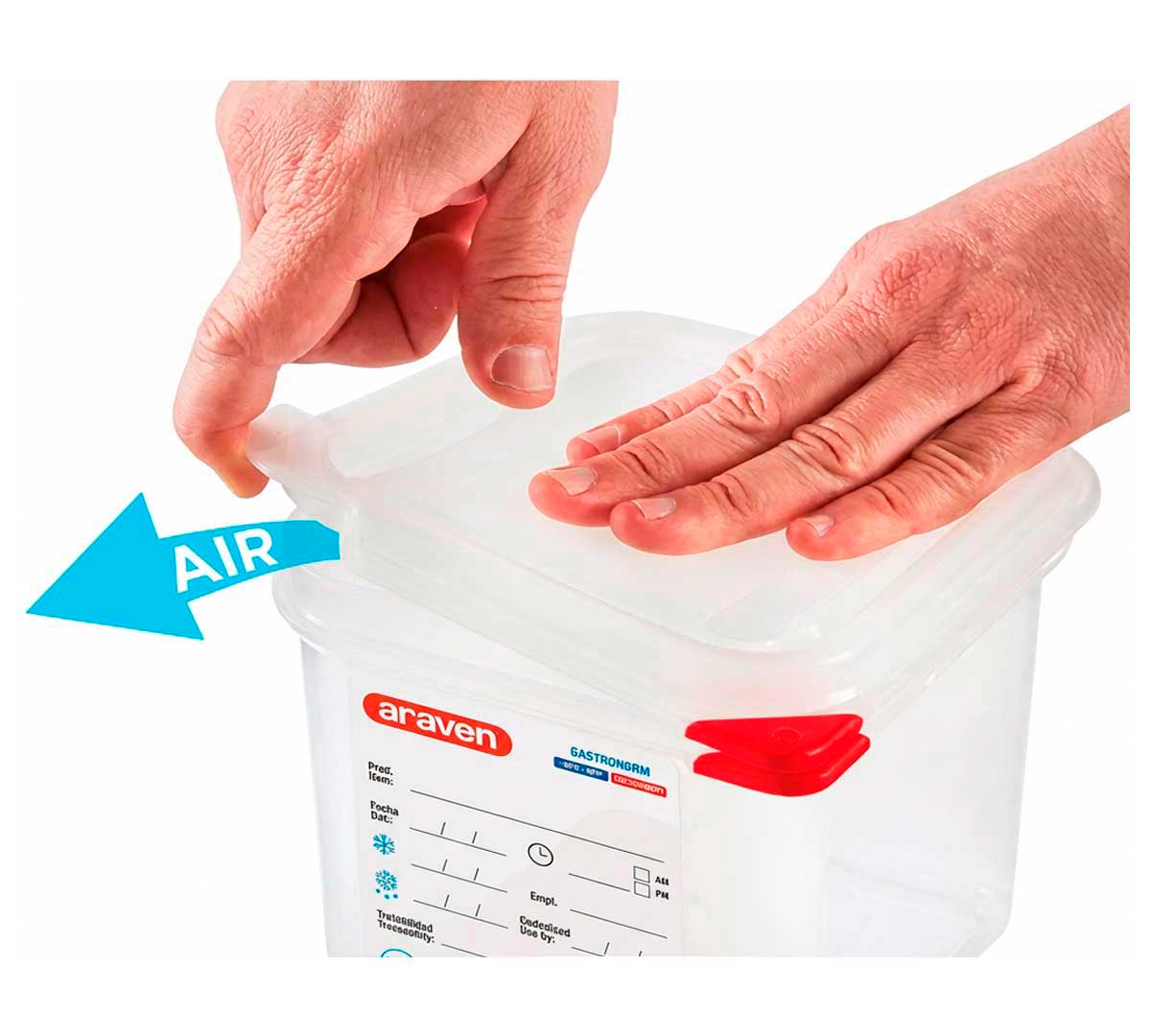 Esta cubeta tiene unas medidas gastronorm GN 1/9 (17,6 x 10,8 cm). Se caracteriza por el cierre hermético y los clips de identificación de colores