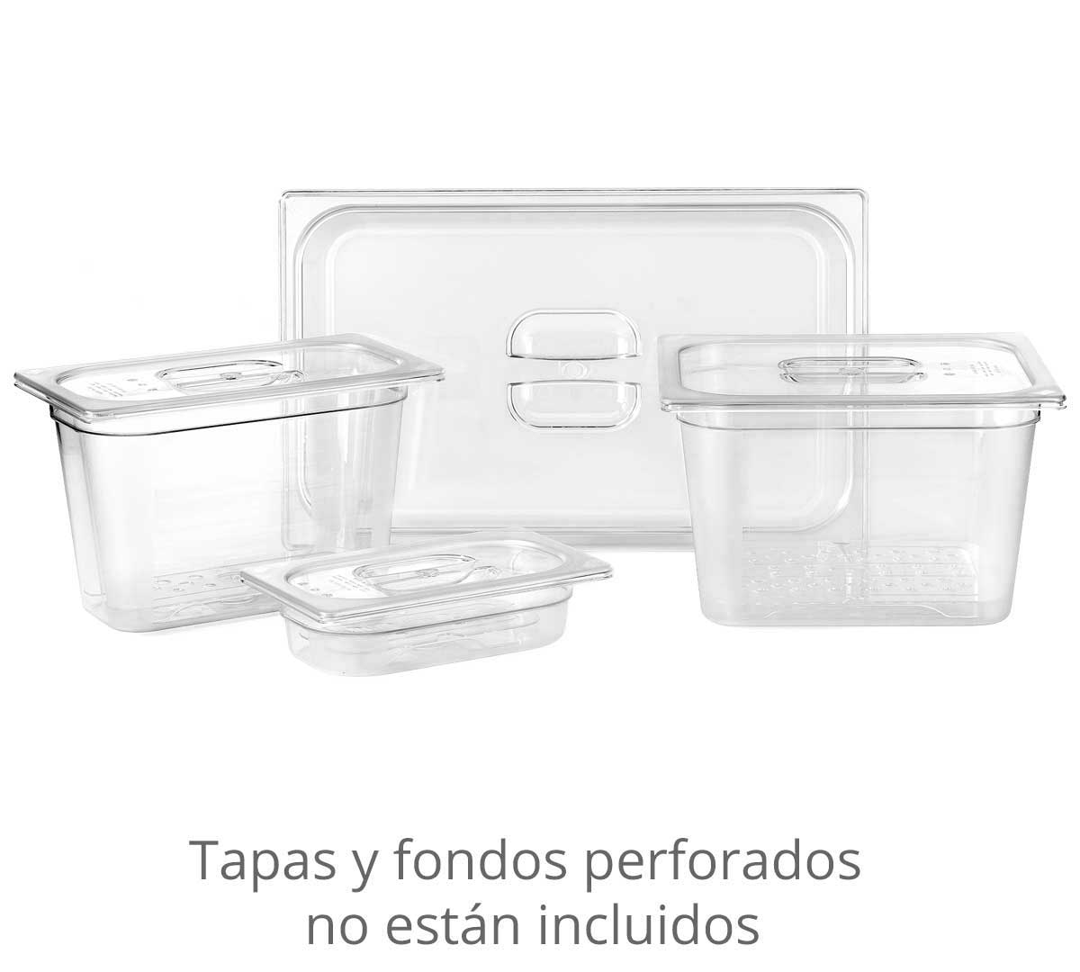 Bandeja Gastronorm 1/9 de copoliester sin Bisfenol-A. Una excelente alternativa al policarbonato. Esta bandeja es perfecta para almacenar productos en cámaras frigoríficas y de preparación. La profundidad oscila entre 6,5 y 10 cm, según el modelo. De diseño apilable.