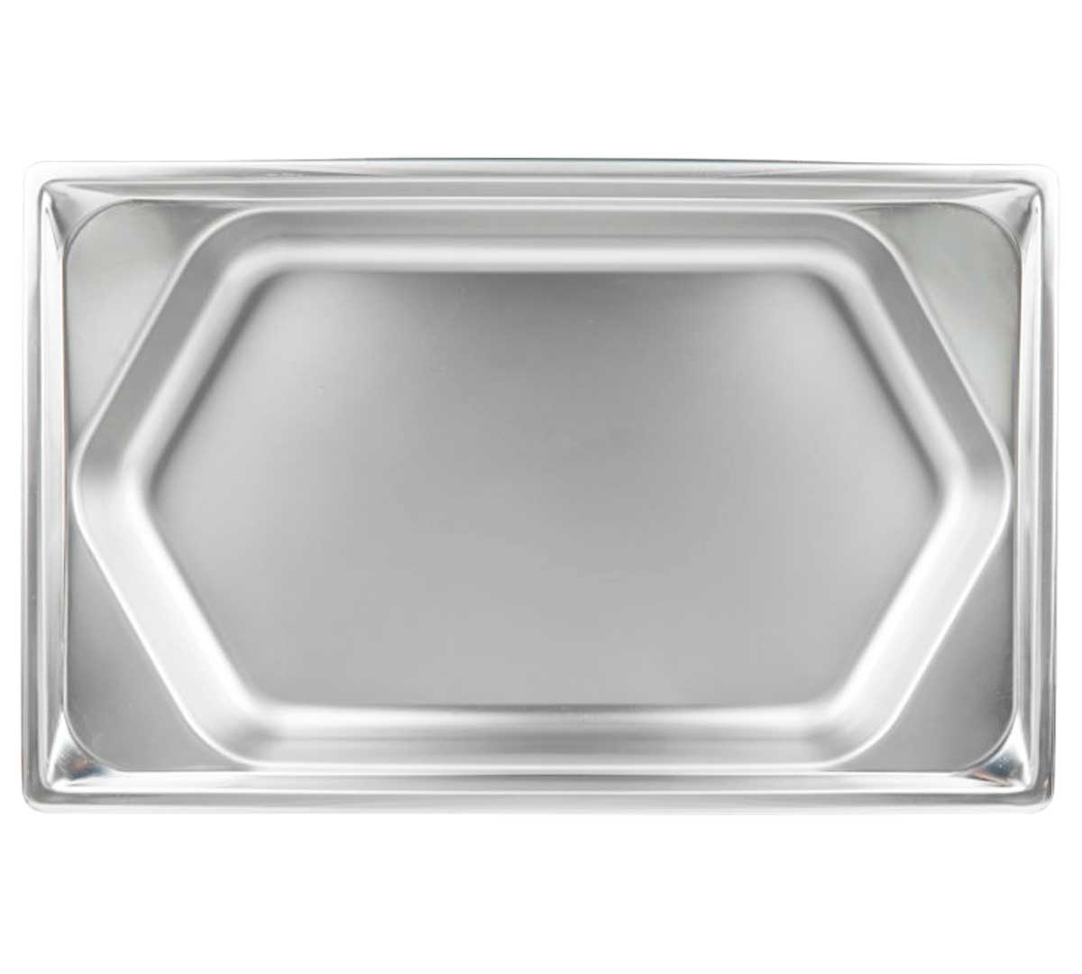 Cubeta inox GN 1/1 con diseño patentado hexagonal. Ideal para la presentación de comidas en chafers, líneas buffet calientes o fríos, vitrinas de presentación y más. Es apilable, tiene certificado NSF. Está disponible en dos modelos con altura de 6,5 o 10 cm.