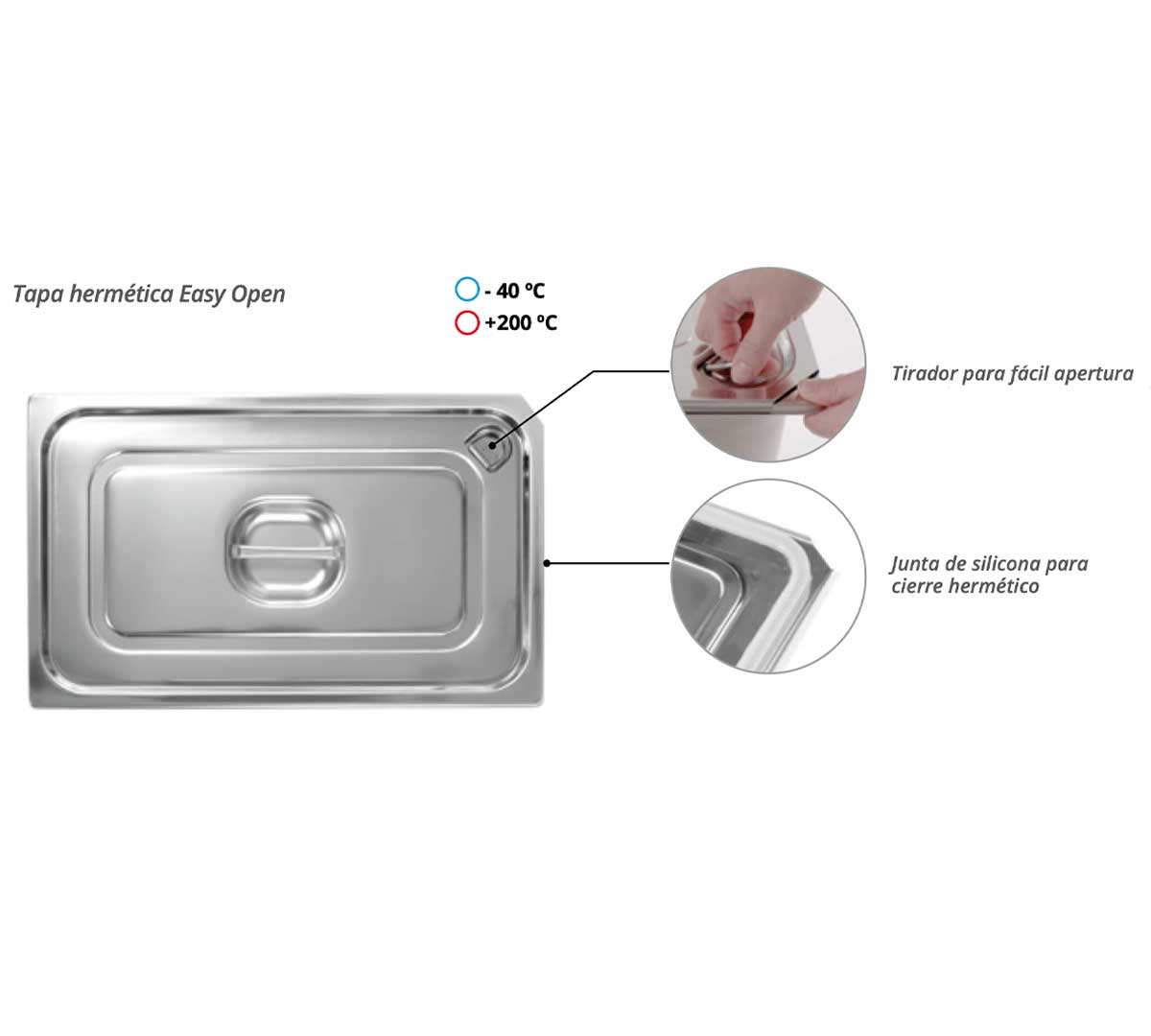 Una tapa pensada para el uso real en cocina profesional. Su sistema Easy Open elimina uno de los problemas más habituales: abrir tapas con vacío. Más rápida, más cómoda y más eficiente en cada servicio.