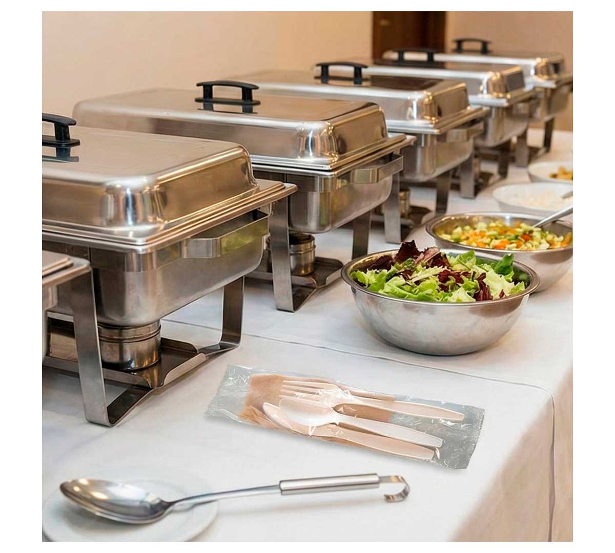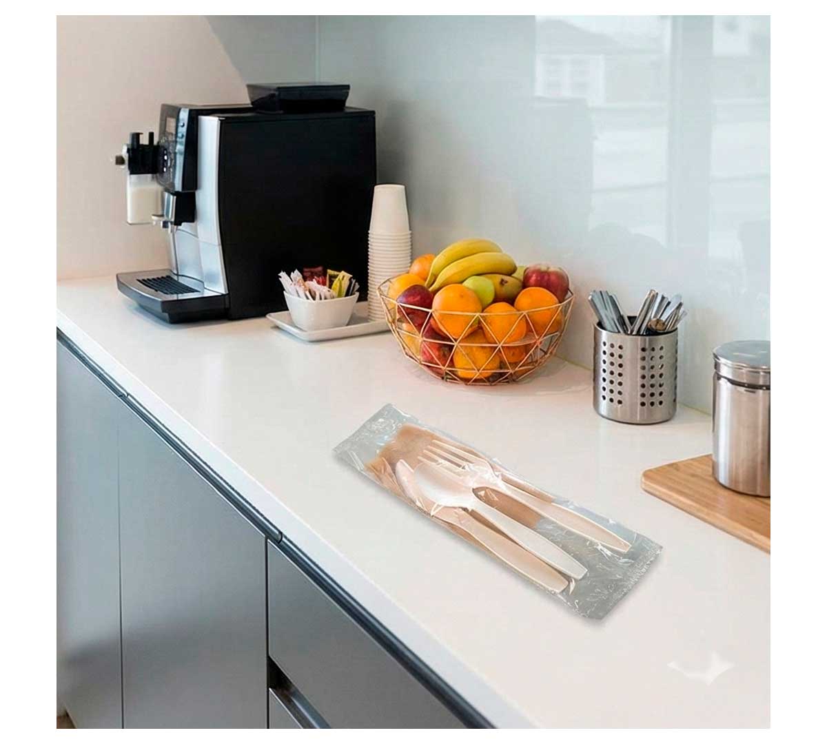 Incluye: cuchara, tenedor, cuchillo y servilleta