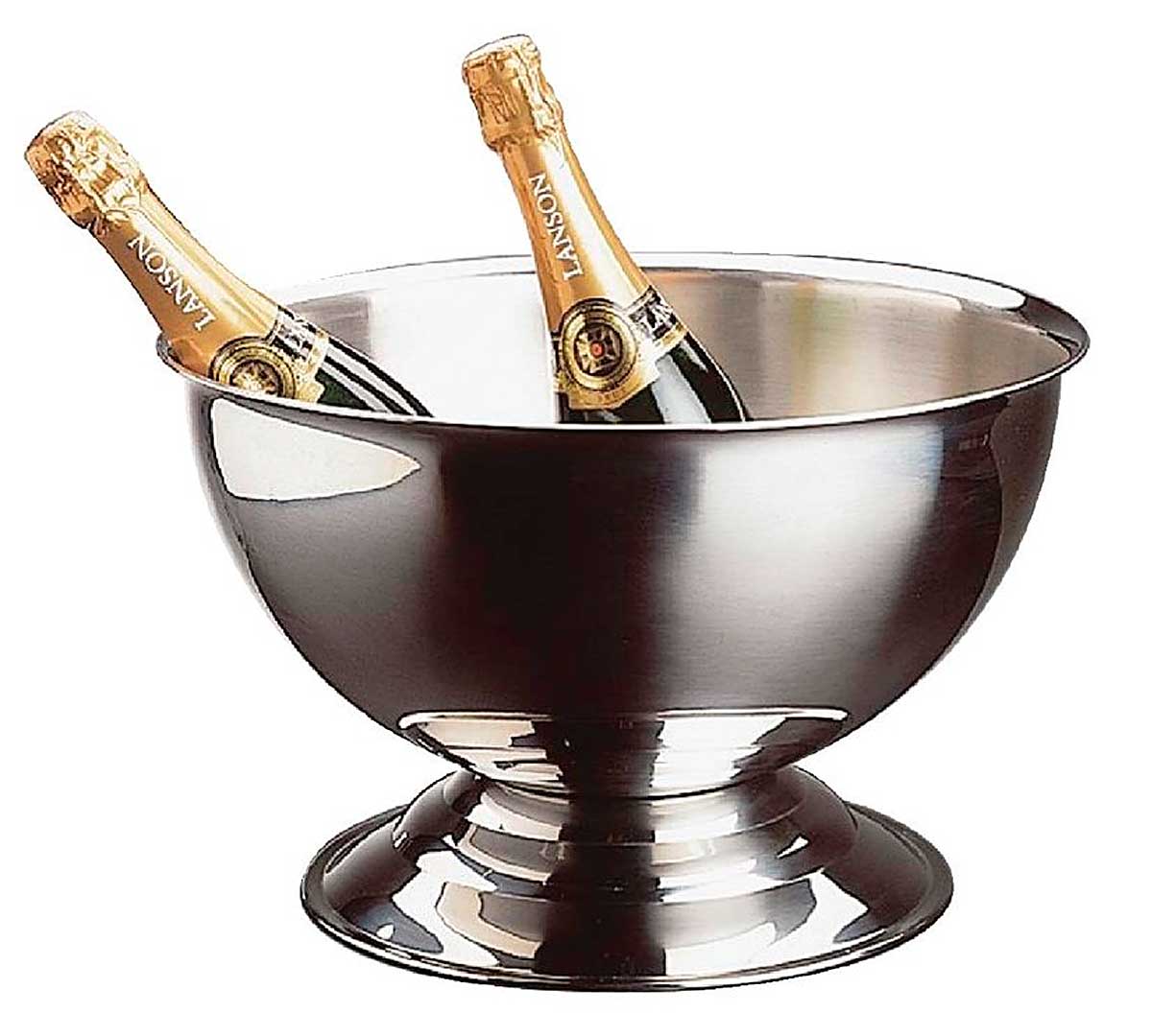 Cubo champanera de acero inoxidable con acabado pulido. Es perfecto para presentación en mesa de botellas de cava.