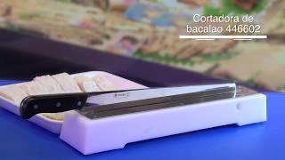 Guillotina para cortar piezas de bacalao. Está fabricada en acero inoxidable. La hoja mide 30 cm. La bacaladera tiene un ancho de 55 cm, un fondo de 8,5 cm y un alto de 11 cm. Pesa 2,56 kg. El soporte es de fibra de polietileno.