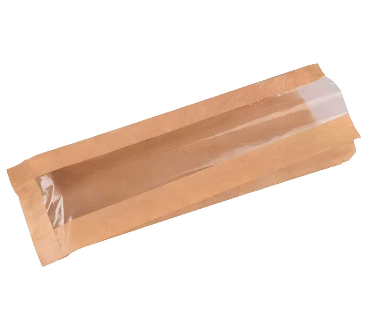 Bolsa kraft con ventana transparente para bocadillo con longitud útil de 34 cm y fuelle lateral de 4 cm, diseñada para cafetería y panadería profesional. Papel apto para contacto alimentario que permite exposición directa del producto en autoservicio.