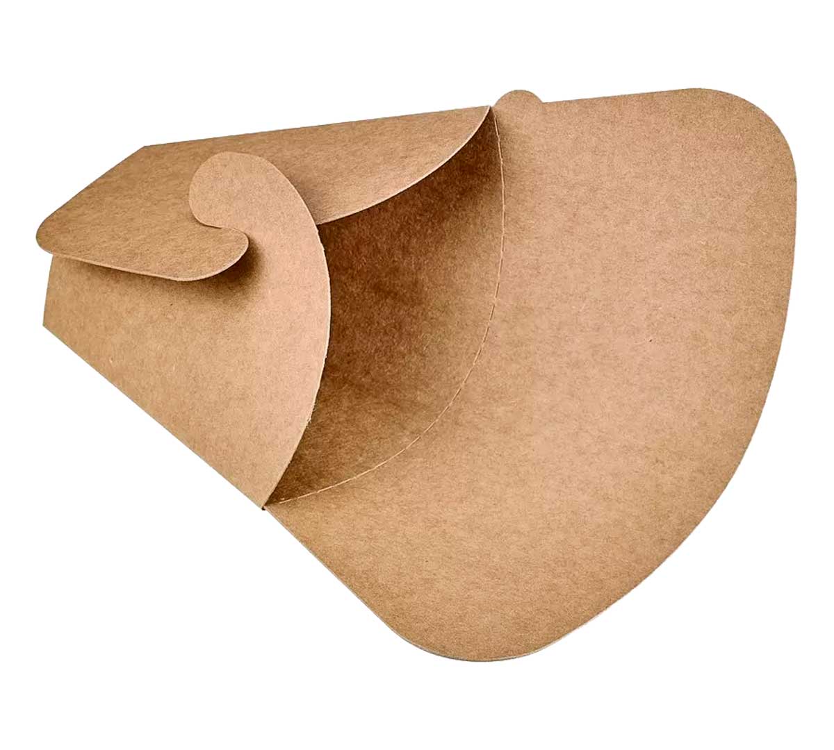 Soporte de cartón kraft, formato triangular. Diseñado para servir crepes de forma higiénica y cómoda en servicios para llevar. Embalaje de 1000 unidades.