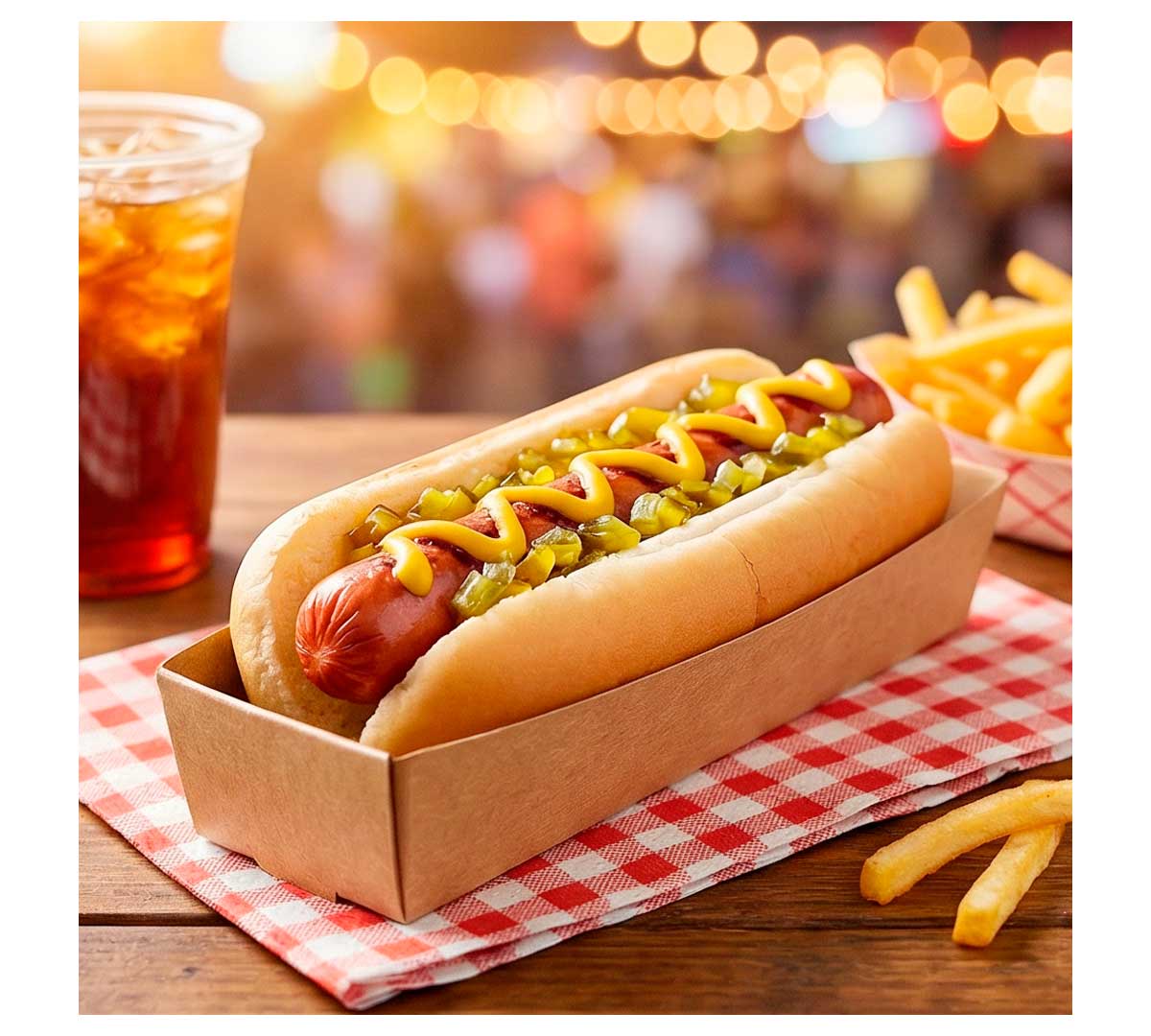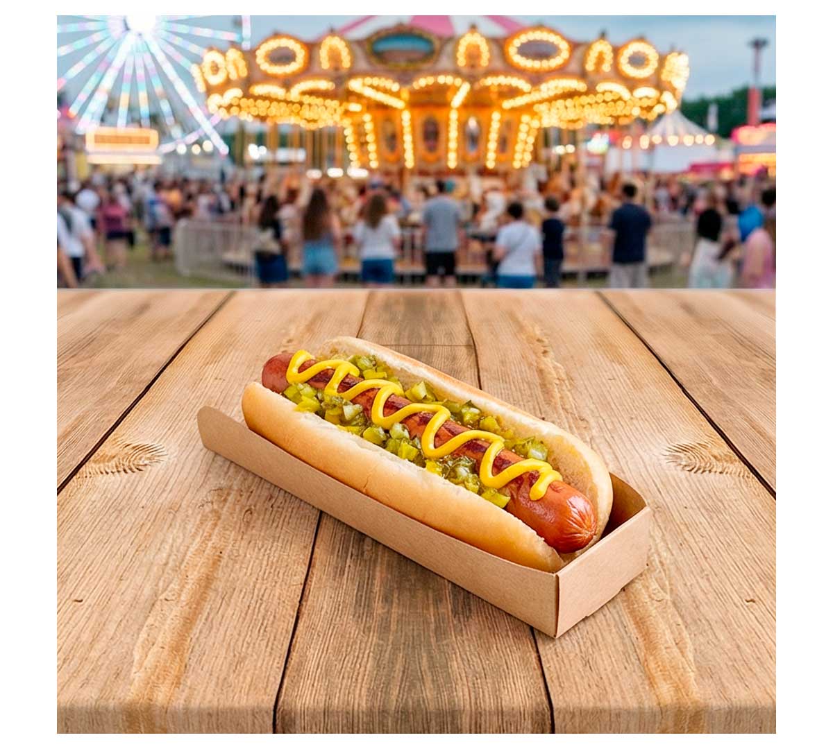 Este soporte de cartón kraft permite servir hot dogs de forma rápida, limpia y profesional, mejorando la experiencia del cliente y facilitando el trabajo en entornos de alta rotación.