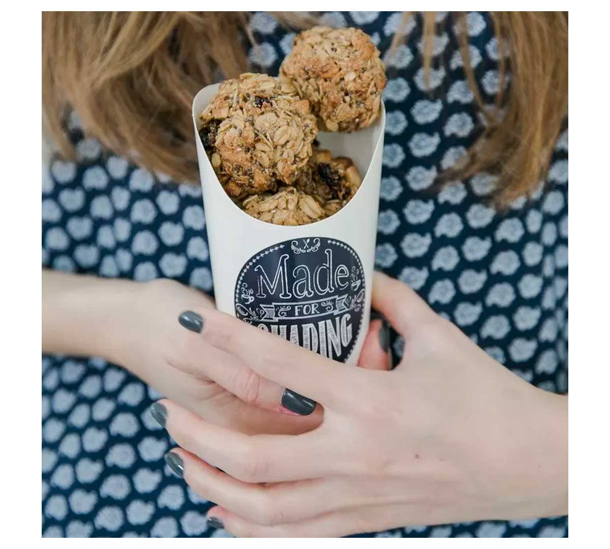 Este envase de cartón, también conocido como vaso para snacks o recipiente para wraps, destaca por su diseño sencillo y profesional, facilitando el servicio rápido y seguro en establecimientos de comida para llevar y take away.