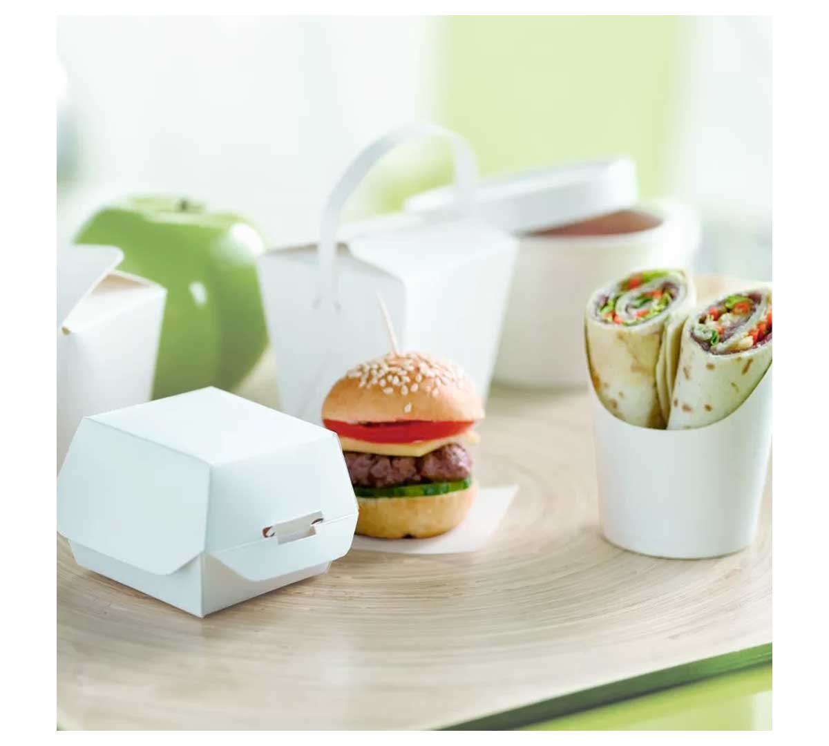 Envases de cartón blanco diseñados para servir burritos, wraps y snacks para llevar. Prácticos, resistentes y disponibles en varios tamaños para adaptarse a diferentes elaboraciones.