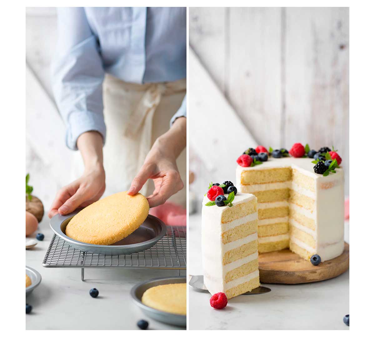 Juego profesional de moldes redondos antiadherentes para pasteles por capas, diseñado para elaborar layer cakes de forma rápida y precisa. Ideal para pastelería y restauración. Permite hornear capas uniformes y superponerlas para obtener tartas altas y bien definidas.