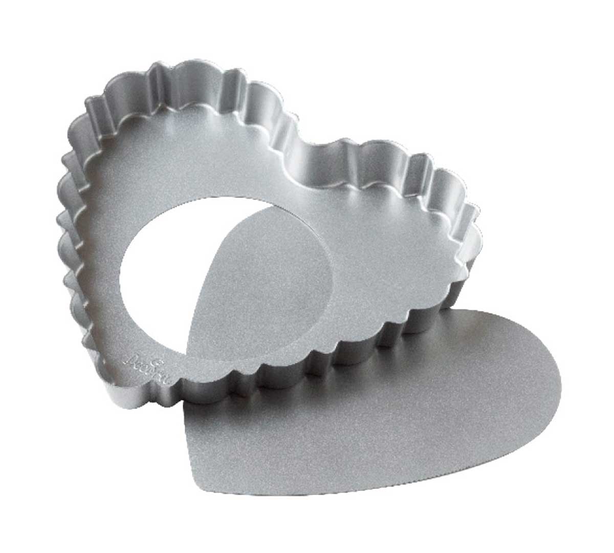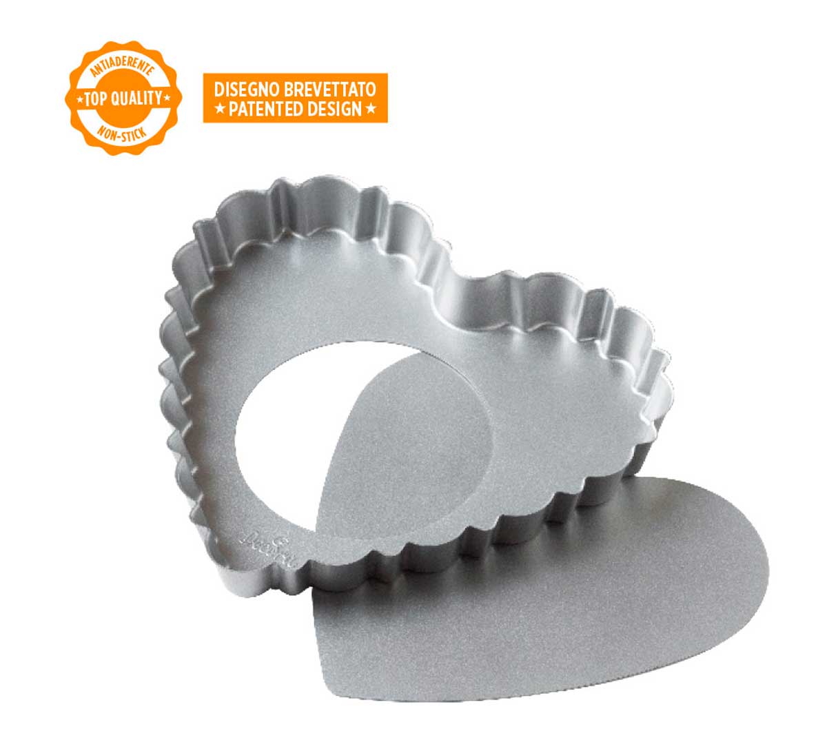 Molde profesional para tartas en forma de corazón con fondo desmontable, fabricado en metal antiadherente. Ideal para pastelería y restauración, permite elaborar tartas dulces o saladas con un acabado decorativo y un desmolde limpio y preciso.