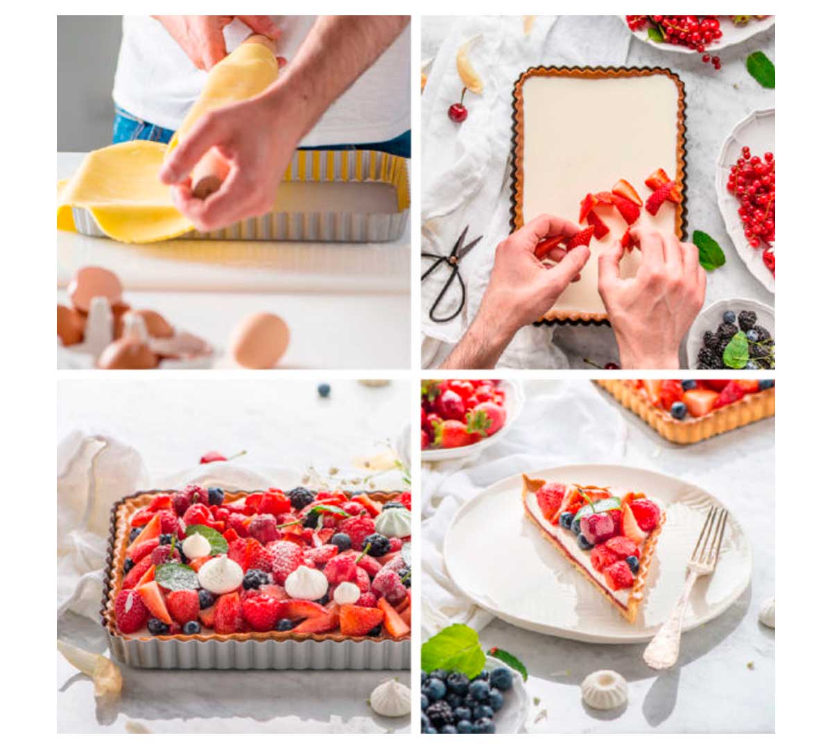 Recomendado para pastelerías, obradores artesanos, restaurantes, hoteles y catering para la elaboración de crostatas rectangulares, quiches, tartas de gran formato y preparaciones horneadas tanto dulces como saladas.