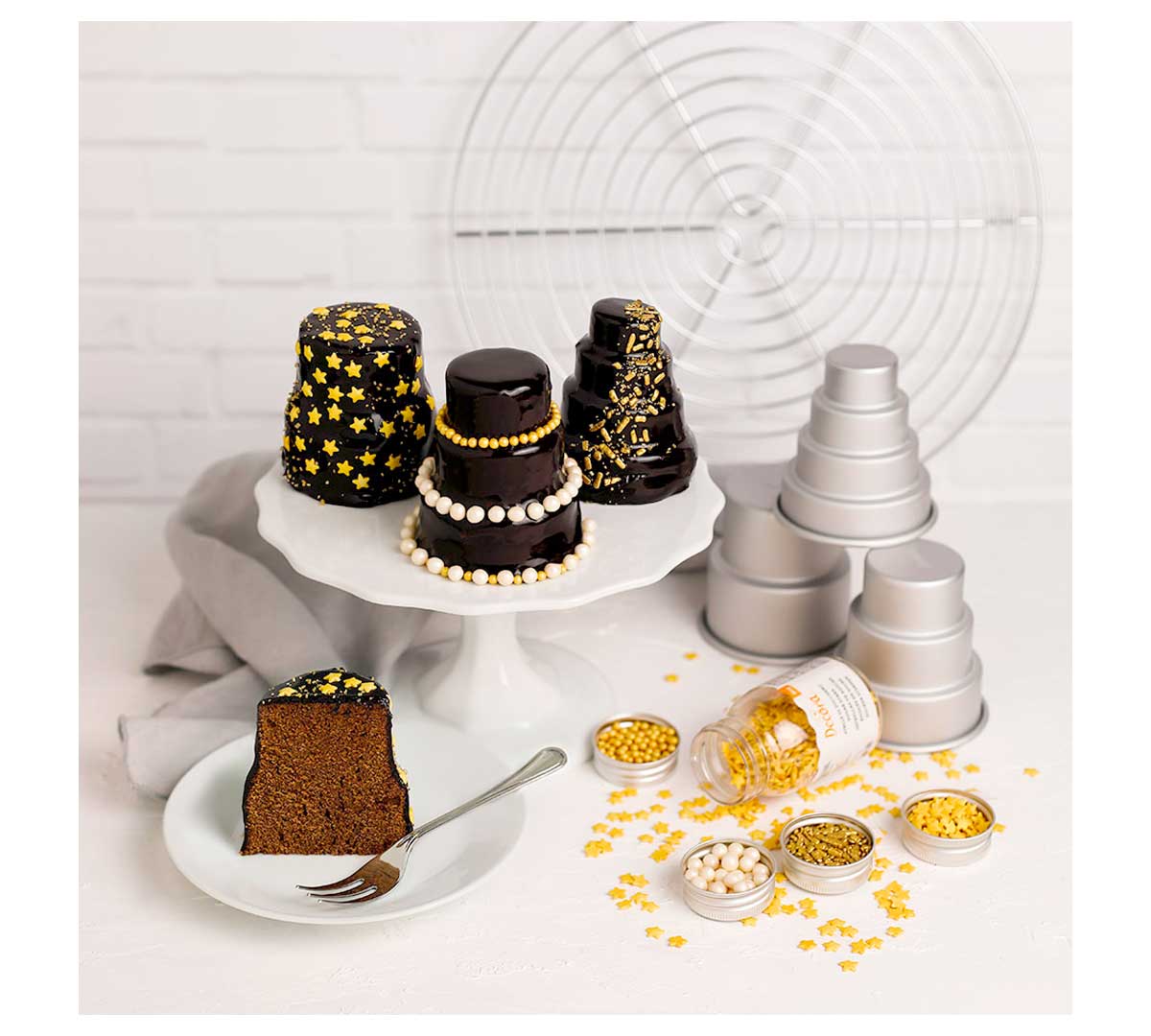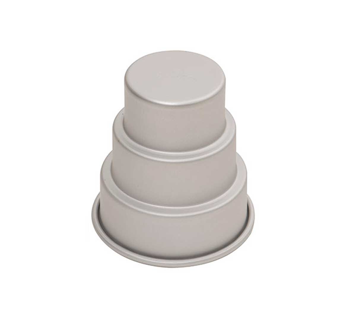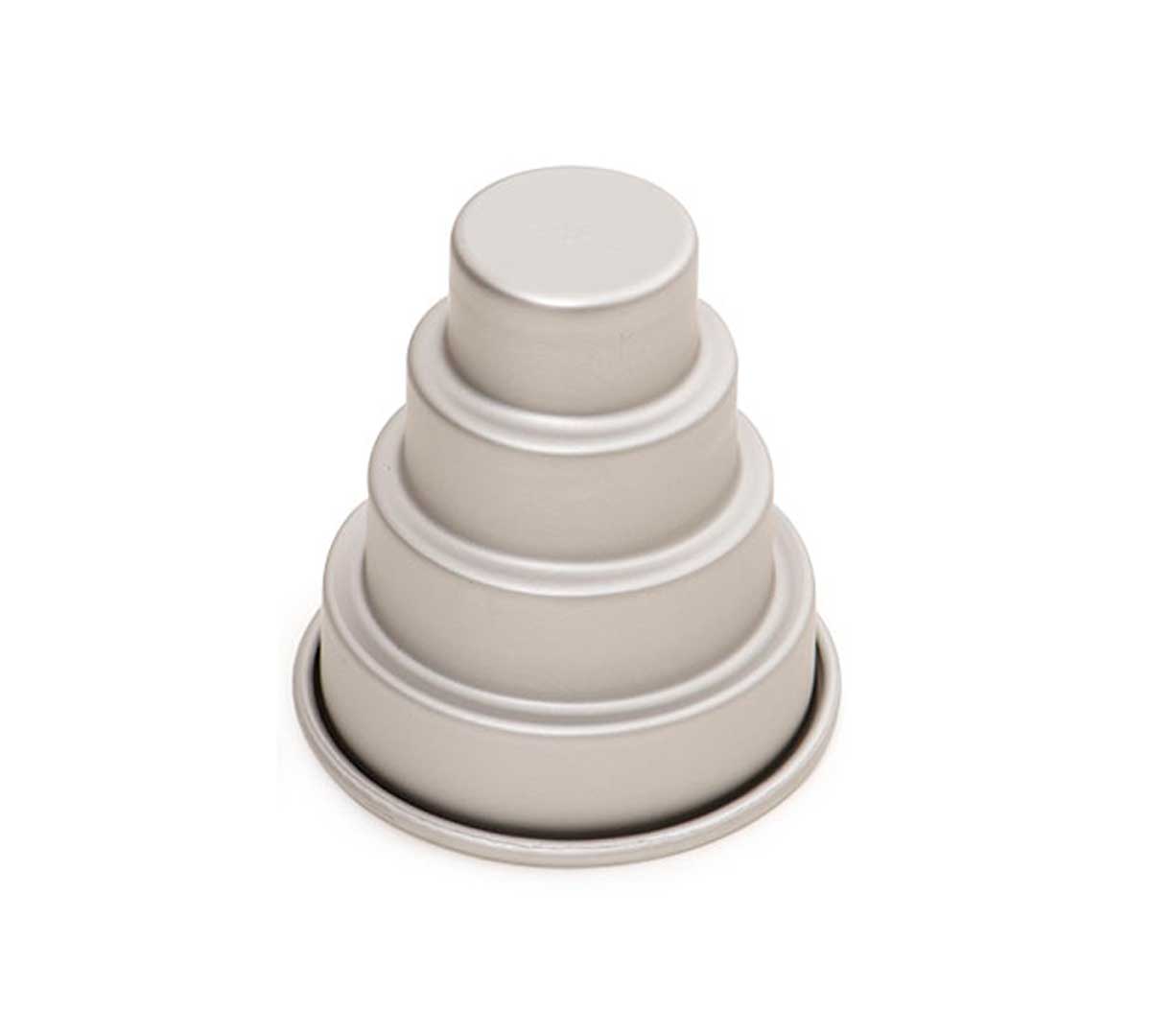 Set de moldes profesionales para mini tartas escalonadas, fabricados en aluminio anodizado sin soldaduras. Ideales para pastelería y restauración, permiten elaborar mini wedding cakes y tartas por pisos con cocción uniforme y formas perfectamente definidas.