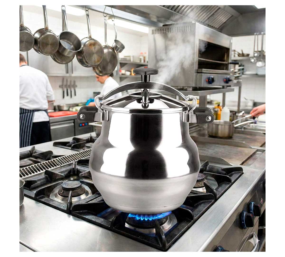 Olla a presión bombeada de aluminio y tapa de acero. Únicamente es apta para fuentes de calor de gas. Está diseñada para soportar una presión de 55 kPa.