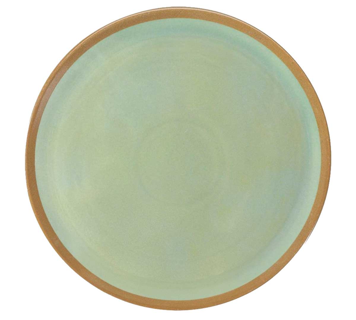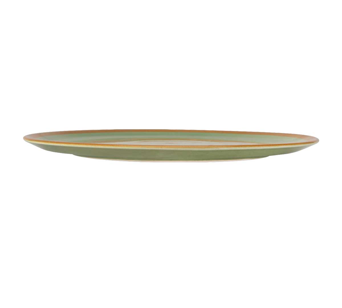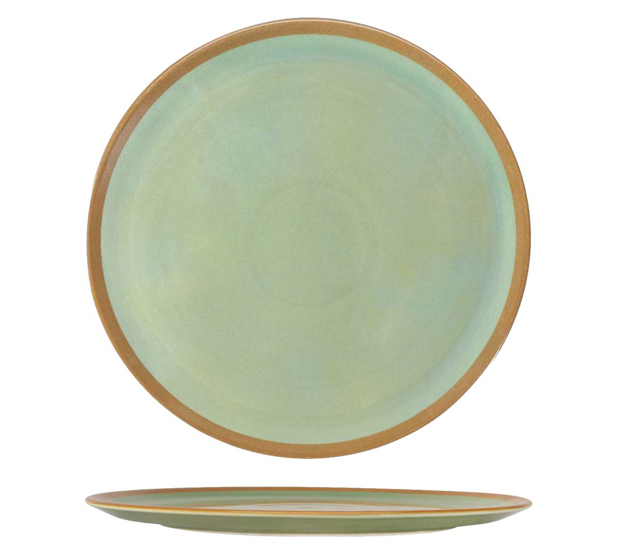 Plato Pizza profesional de porcelana vitrificada con acabado verde oliva y borde terracota. Ideal para restaurantes y hoteles que buscan una presentación cálida, natural y resistente para pizzas y platos de gran formato.