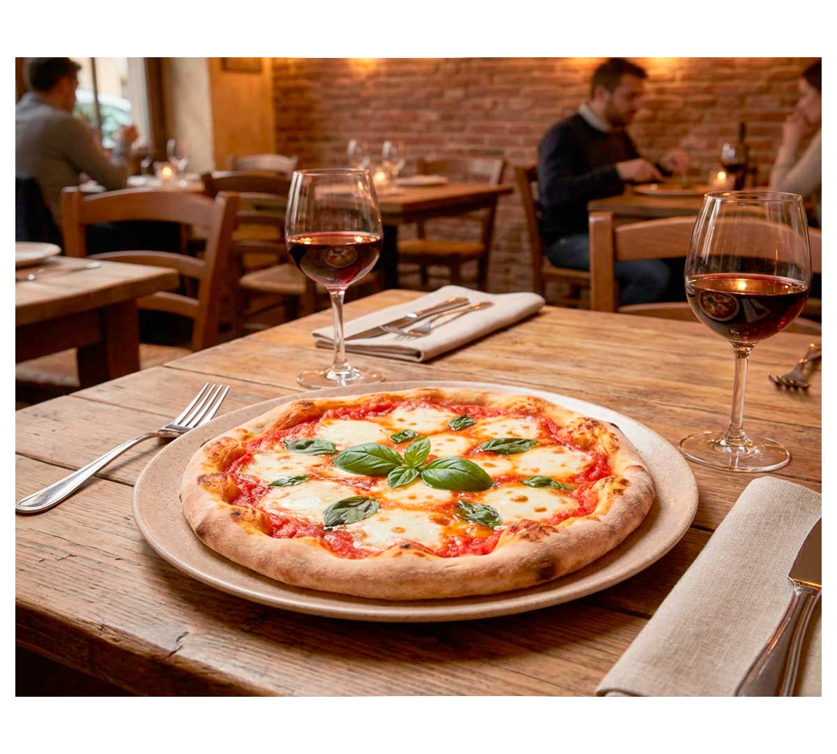 Plato Pizza profesional de porcelana vitrificada en tonos tierra cálidos. Diseñado para restauración. Ideal para restaurantes, hoteles y pizzerías que buscan una presentación natural, equilibrada y resistente para pizzas y recetas de gran formato.