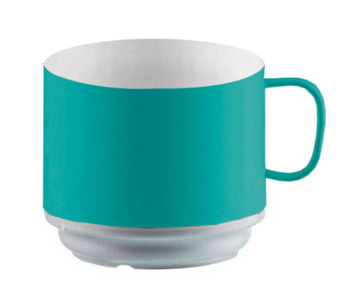 Taza de polipropileno. Este producto está diseñada en color blanco, azul, verde y crema. Es perfecto para uso en colectividades y catering. Es apto para lavavajillas y microondas. La tapa se vende por separado.