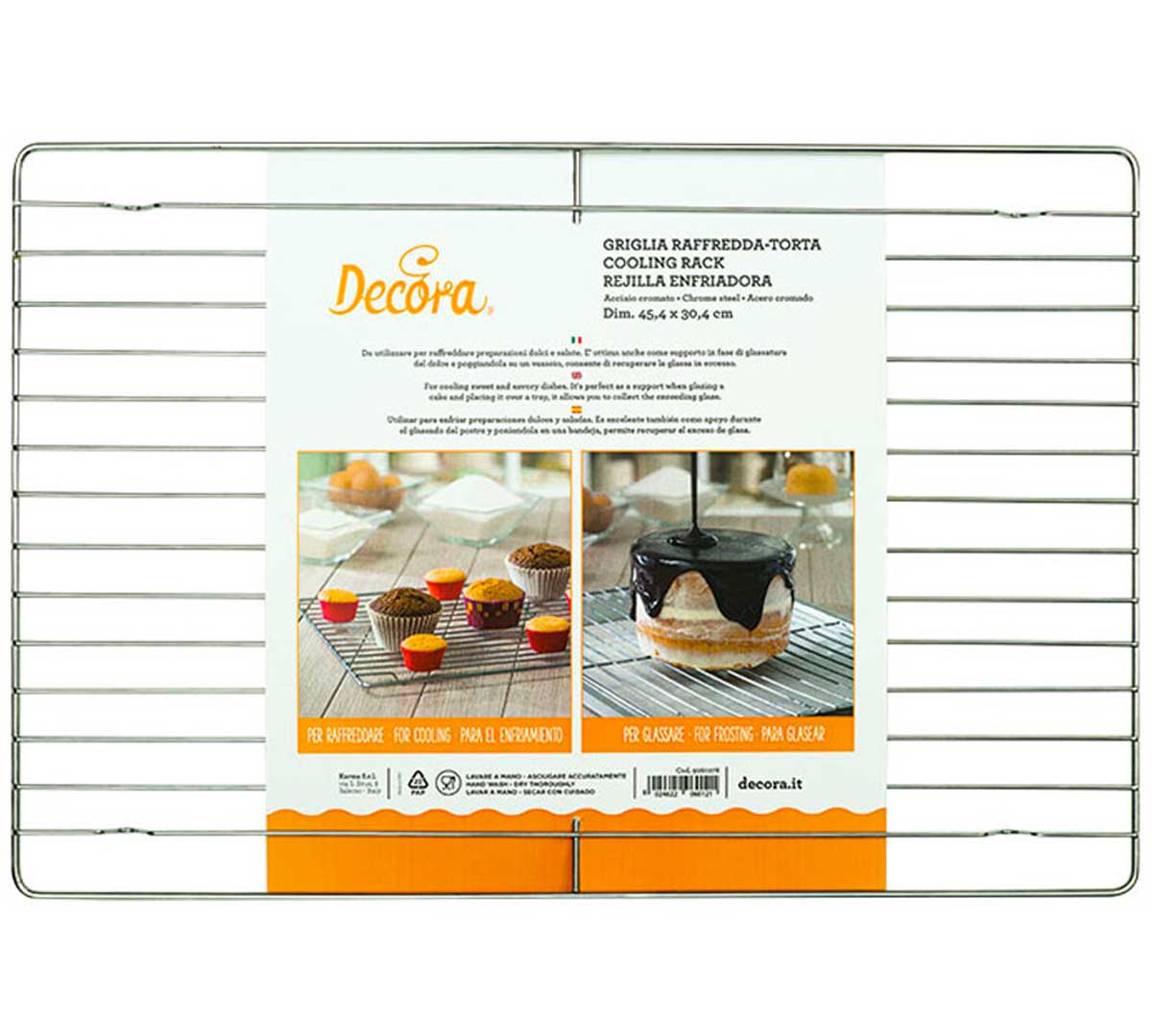 La Rejilla Enfriadora 9260278 Decora pertenece a la gama de utensilios básicos de pastelería profesional de la marca, fabricada en acero cromado y pensada para optimizar el flujo de trabajo en el enfriado y acabado final de tartas y bizcochos.