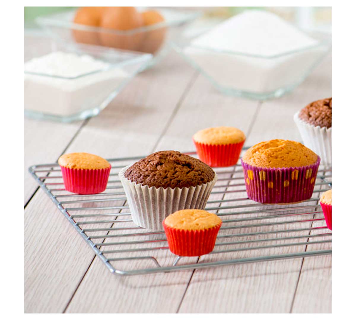 La rejilla de 45,4 x 30,4 cm encaja perfectamente en bandejas estándar, permitiendo enfriar tartas sin necesidad de recipientes adicionales.