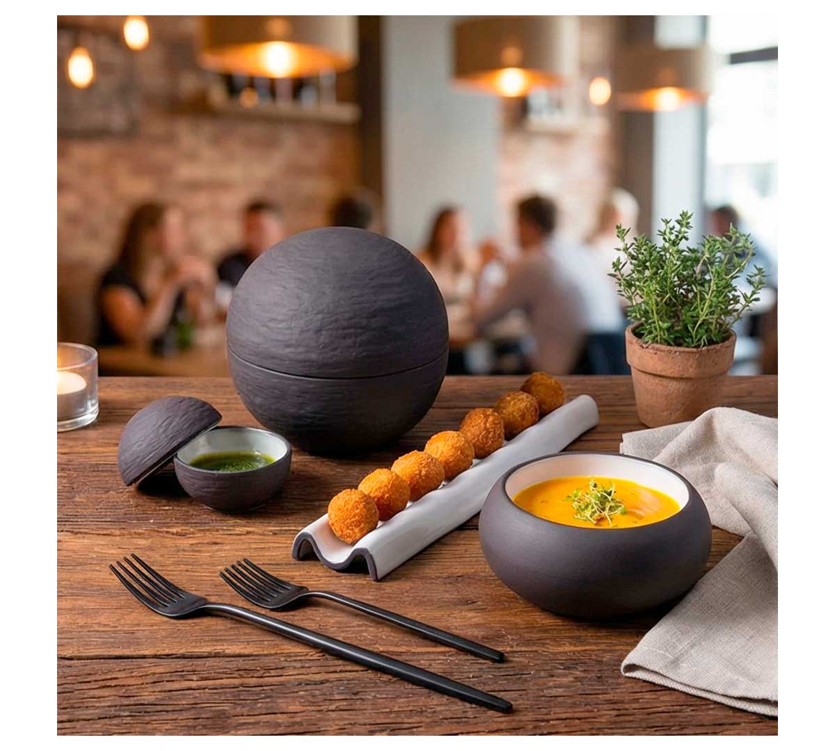 El diseño esférico crea una presentación elegante y ayuda a contener mejor ciertos alimentos líquidos o emulsiones. Además, su forma facilita el manejo y transporte en el servicio profesional, aportando un toque distintivo frente a platos tradicionales planos.