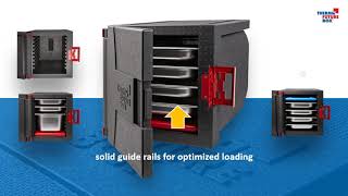 Contenedor isotérmico de carga frontal. La puerta es abatible y desmontable. Tiene un asa resistente para transportarlo con una sola mano. Es apilable y está fabricado en polipropileno expandido. Apto para cubetas GN 1/1, GN 1/2 o GN 1/3. Tiene 9 pares de guías con una distancia de 3,8 cm.