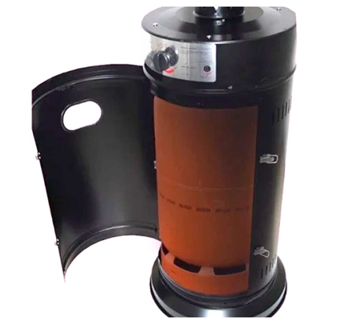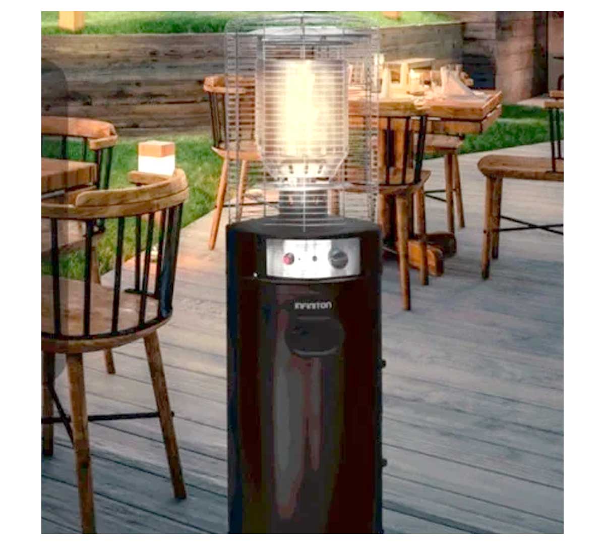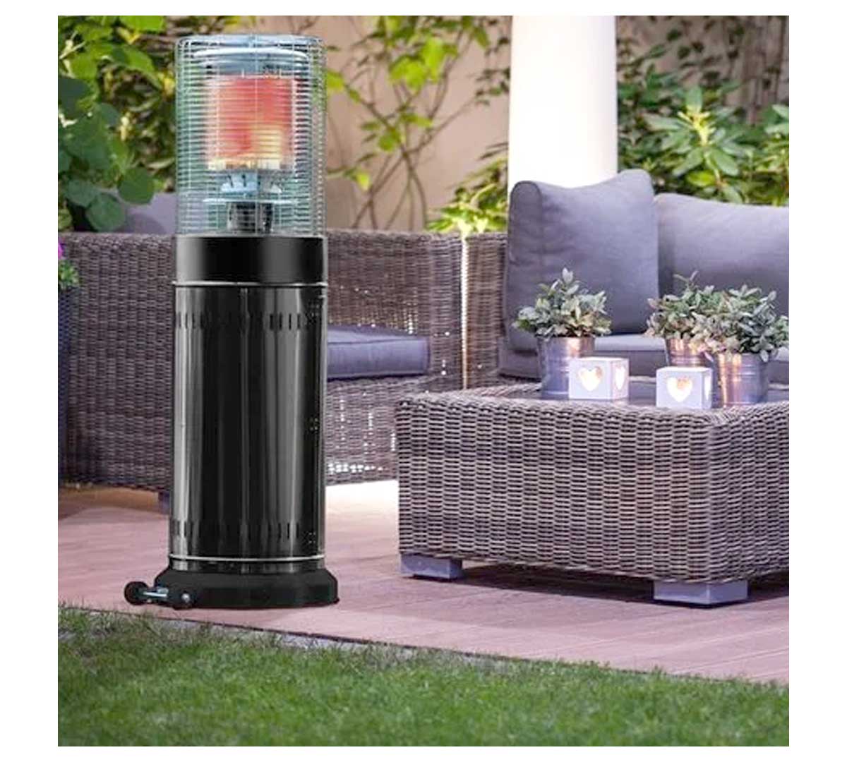 Estufa baja de color negro, ideal para terrazas. Tiene una potencia de 11 kW y una cobertura aproximada de unos 25 m². Con ruedas para un fácil transporte. Indicada para gas butano, propano y mezclas (GLP).