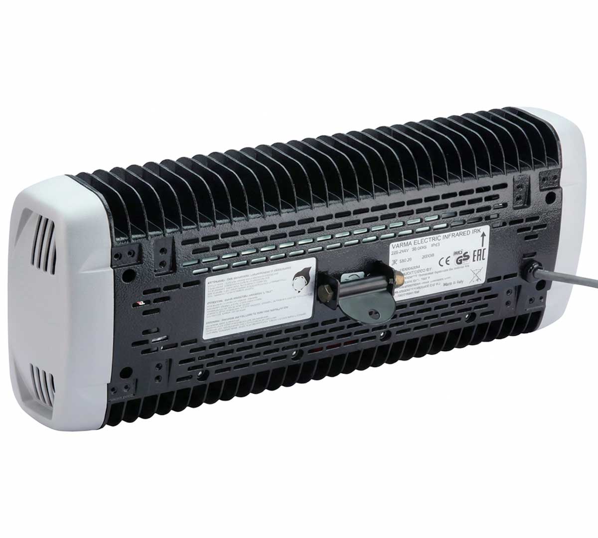 Estufa radiante eléctrica para instalación en pared o techo. Orientable. Con carcasa de aluminio y dos potencias disponibles. Calienta áreas de hasta 20 m² con diseño compacto y robusto.