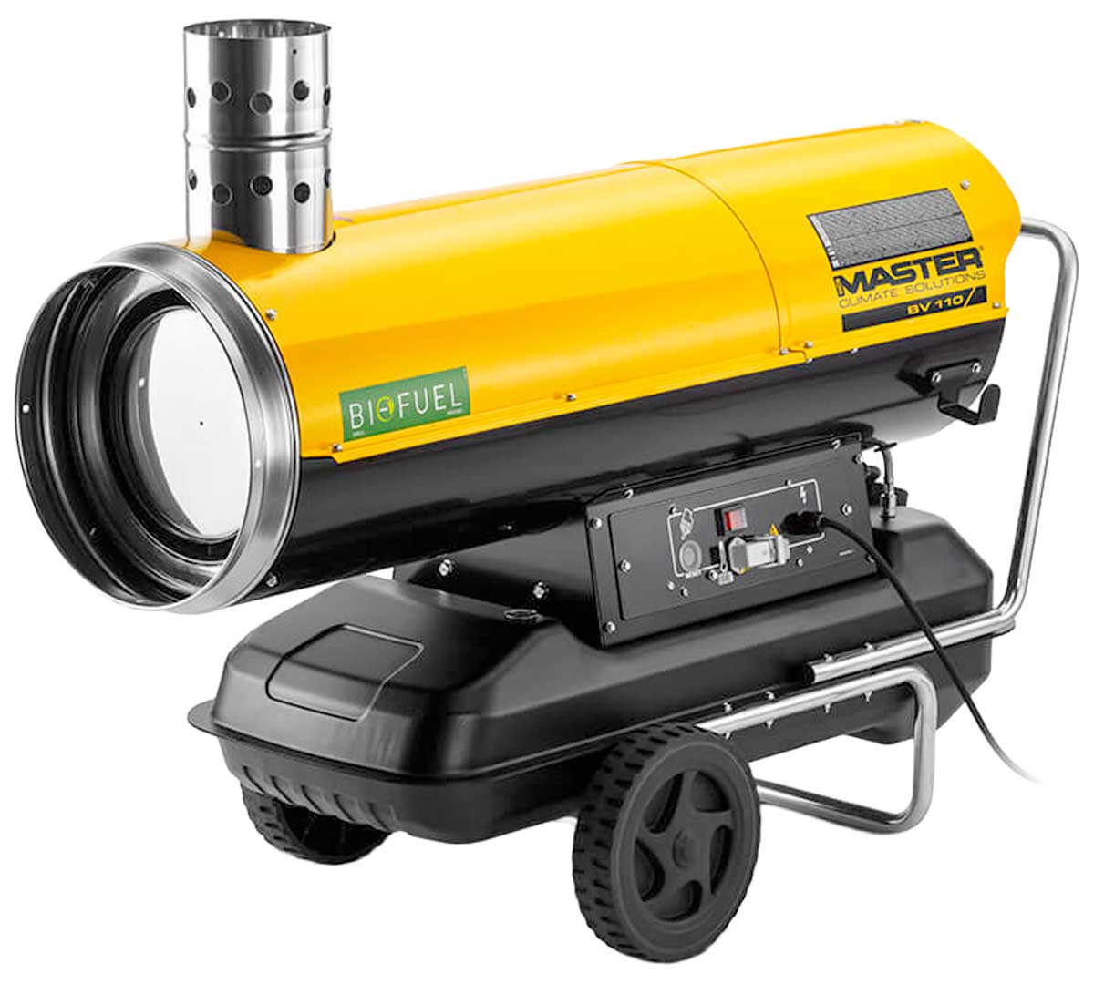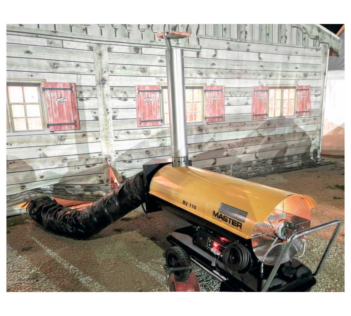 El Master BV 110 proporciona calefacción segura y eficiente en eventos, naves y zonas de trabajo interiores, combinando potencia estable, robustez y excelente capacidad de distribución del aire caliente.