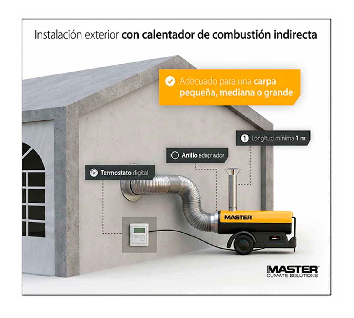 Este calefactor industrial es perfecto para calentar grandes superficies, como naves, carpas, talleres, invernaderos, almacenes y espacios donde se requiera una solución de calefacción portátil y eficiente. Su tecnología de combustión indirecta lo hace especialmente indicado para lugares donde es imprescindible mantener el aire limpio y libre de humos.
